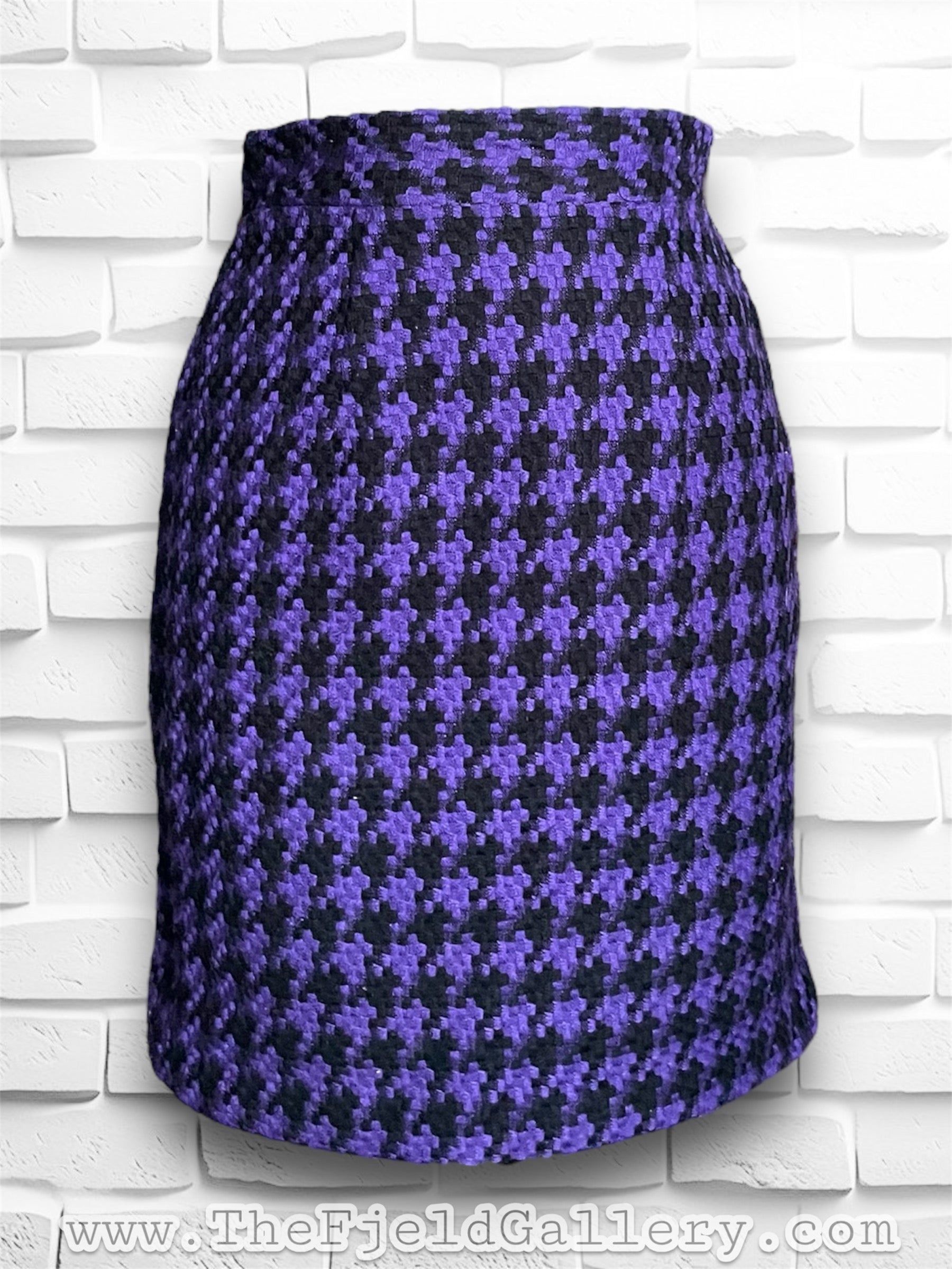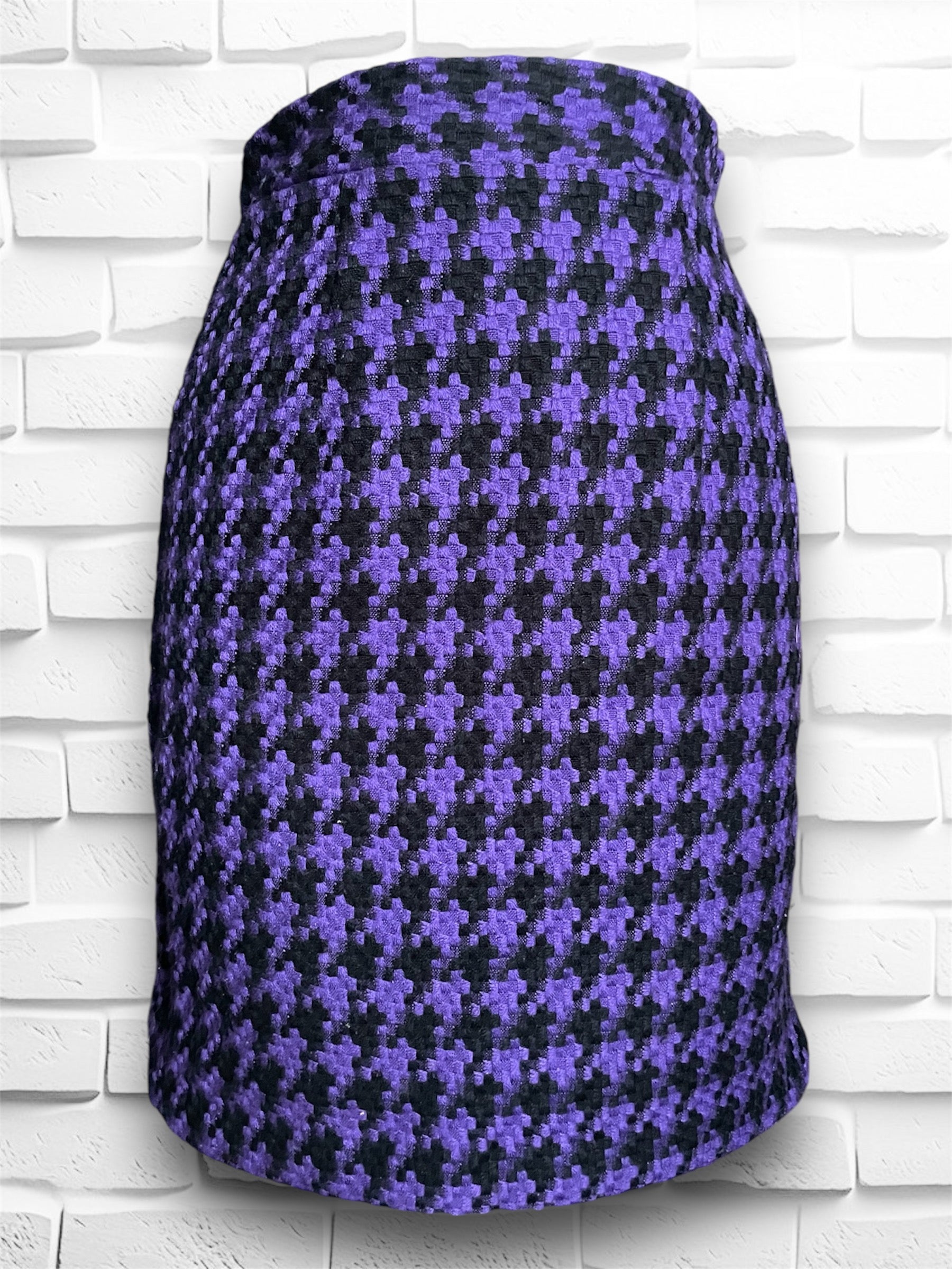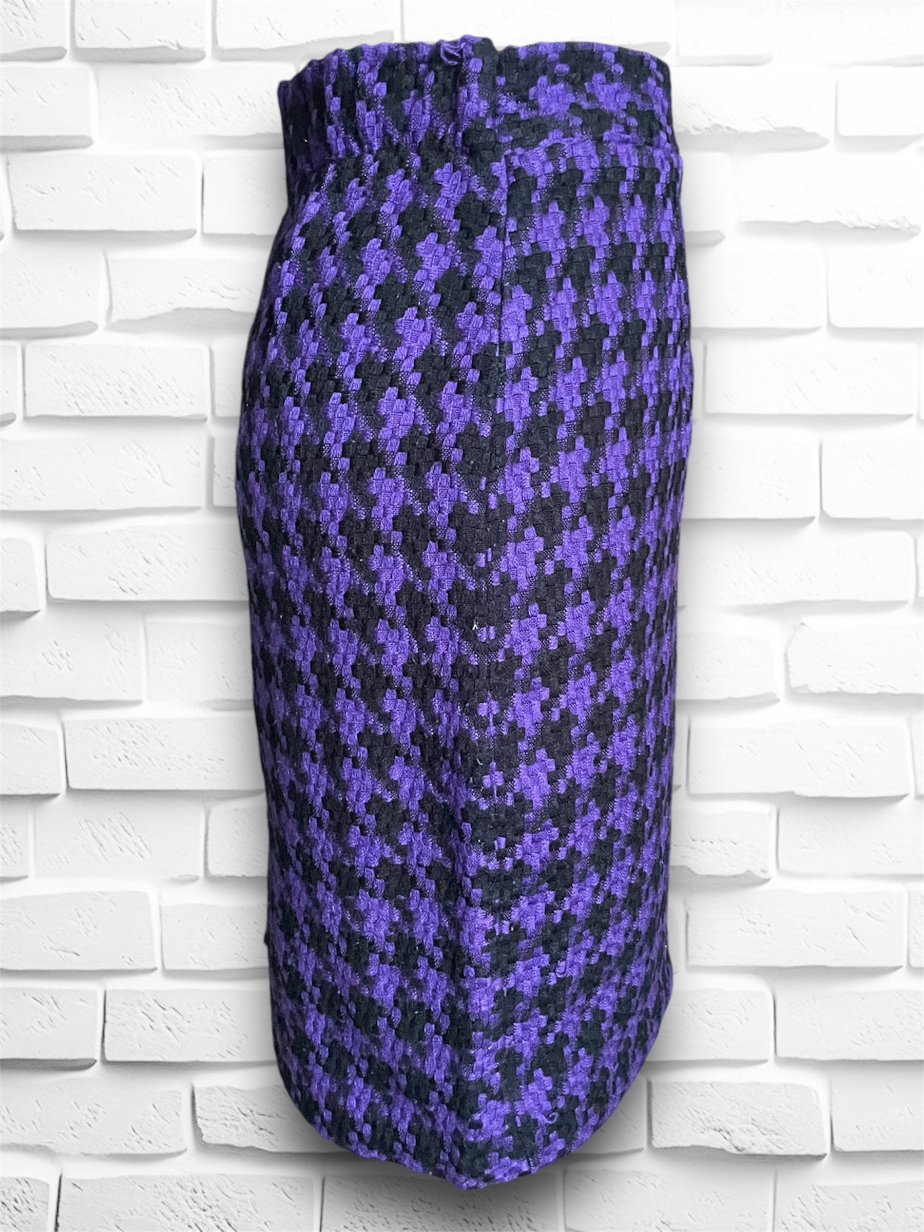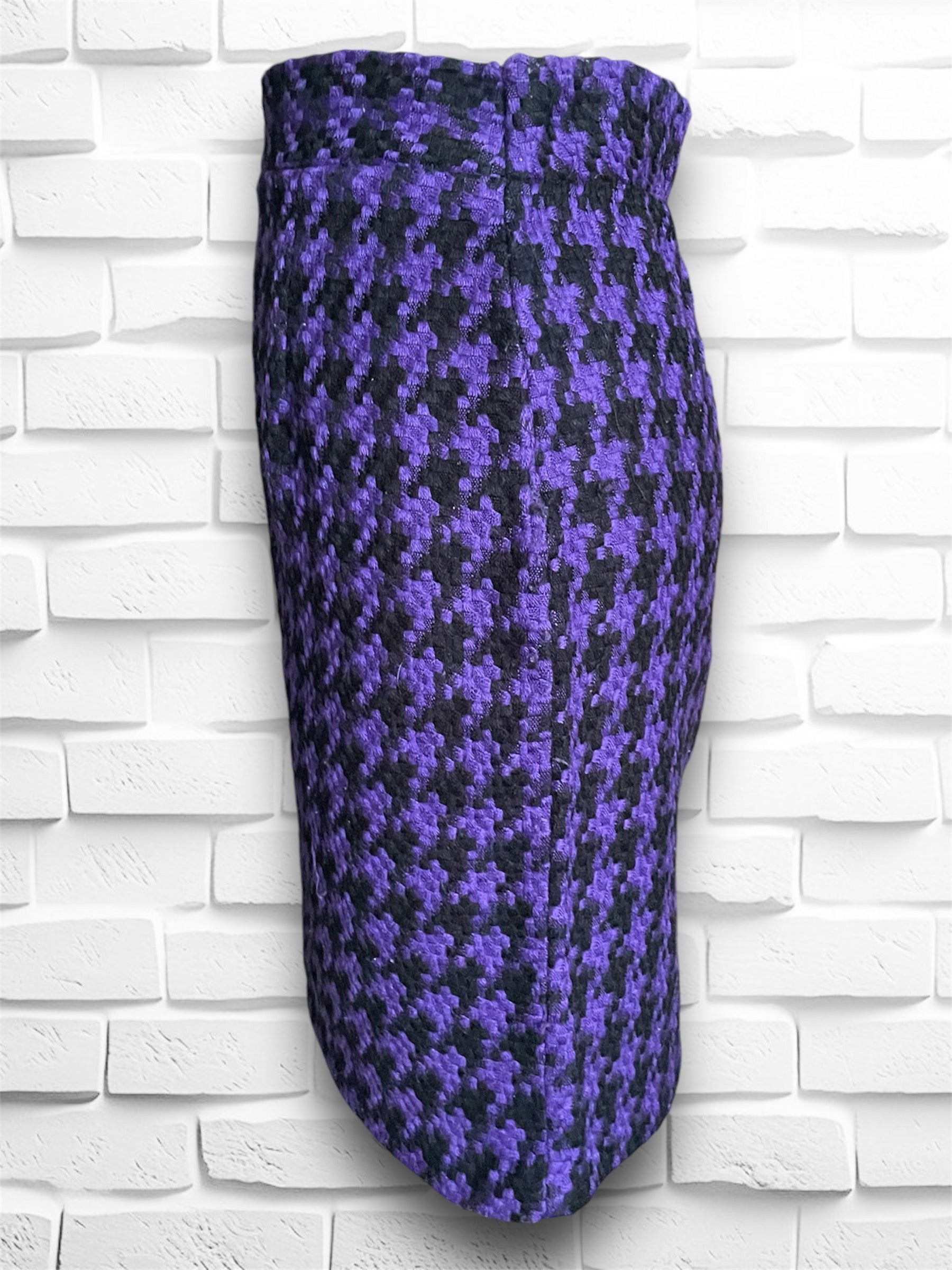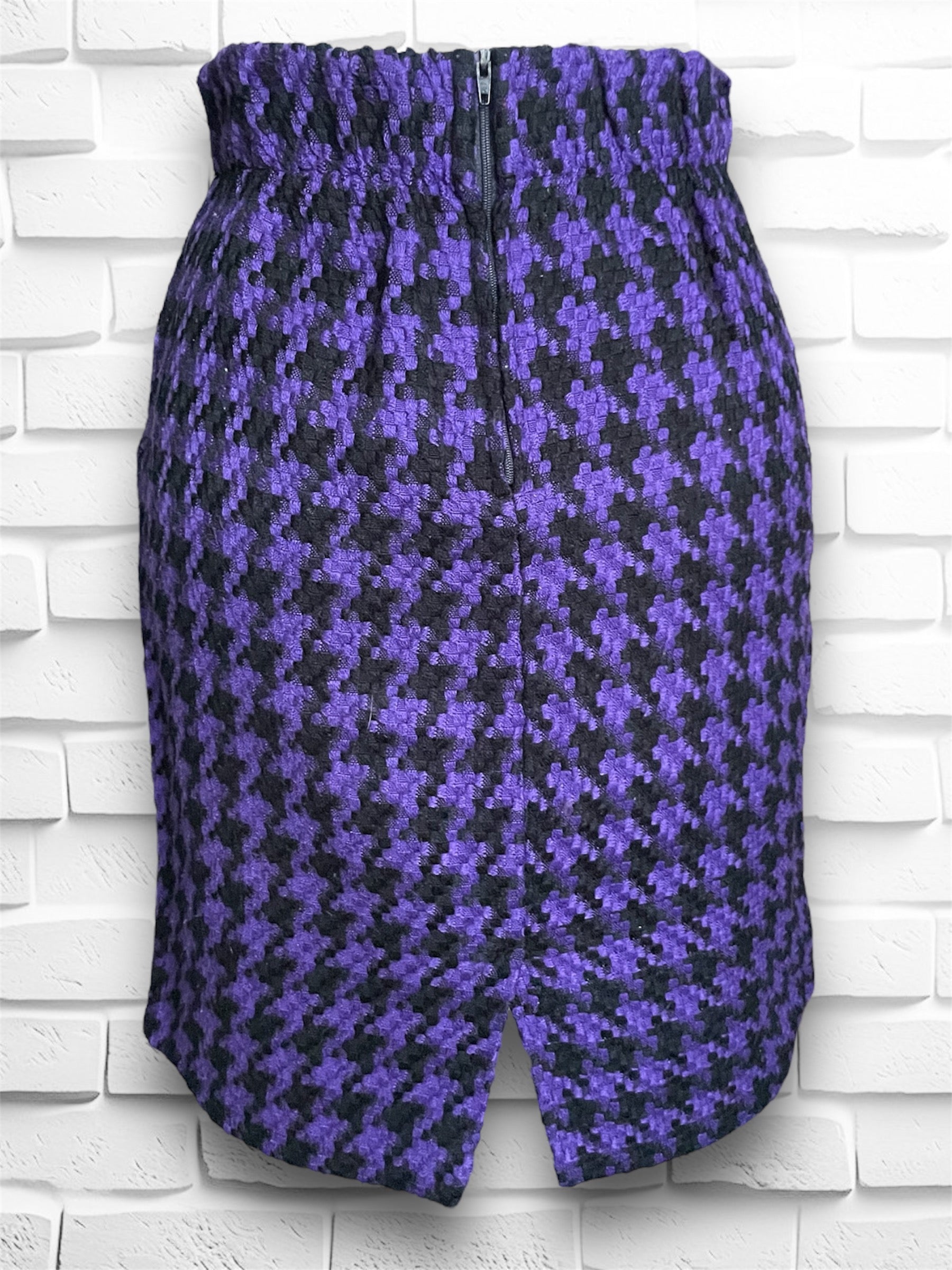 Super cute vintage purple & black houndstooth wool mini pencil skirt. No name label was found but Size tag reads M and Made in USA Dry Clean Only. Has a zipper closure on the back as well as an elastic waistband on the back half only. Also has a small slit in the back middle.