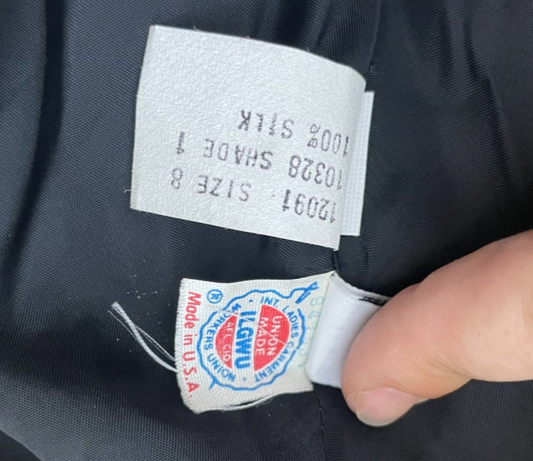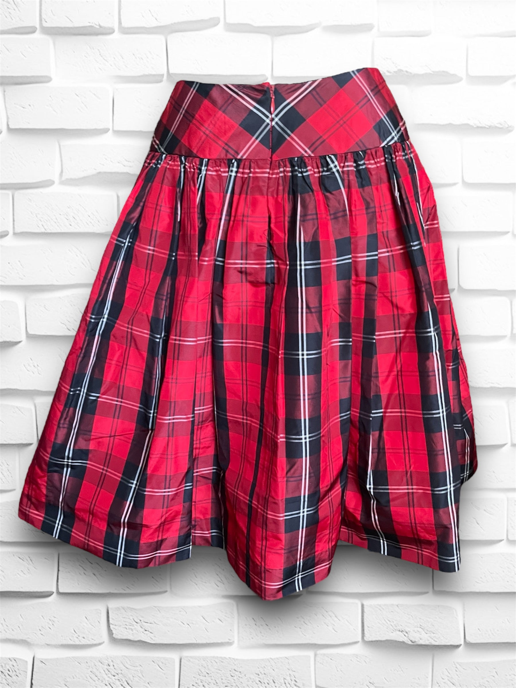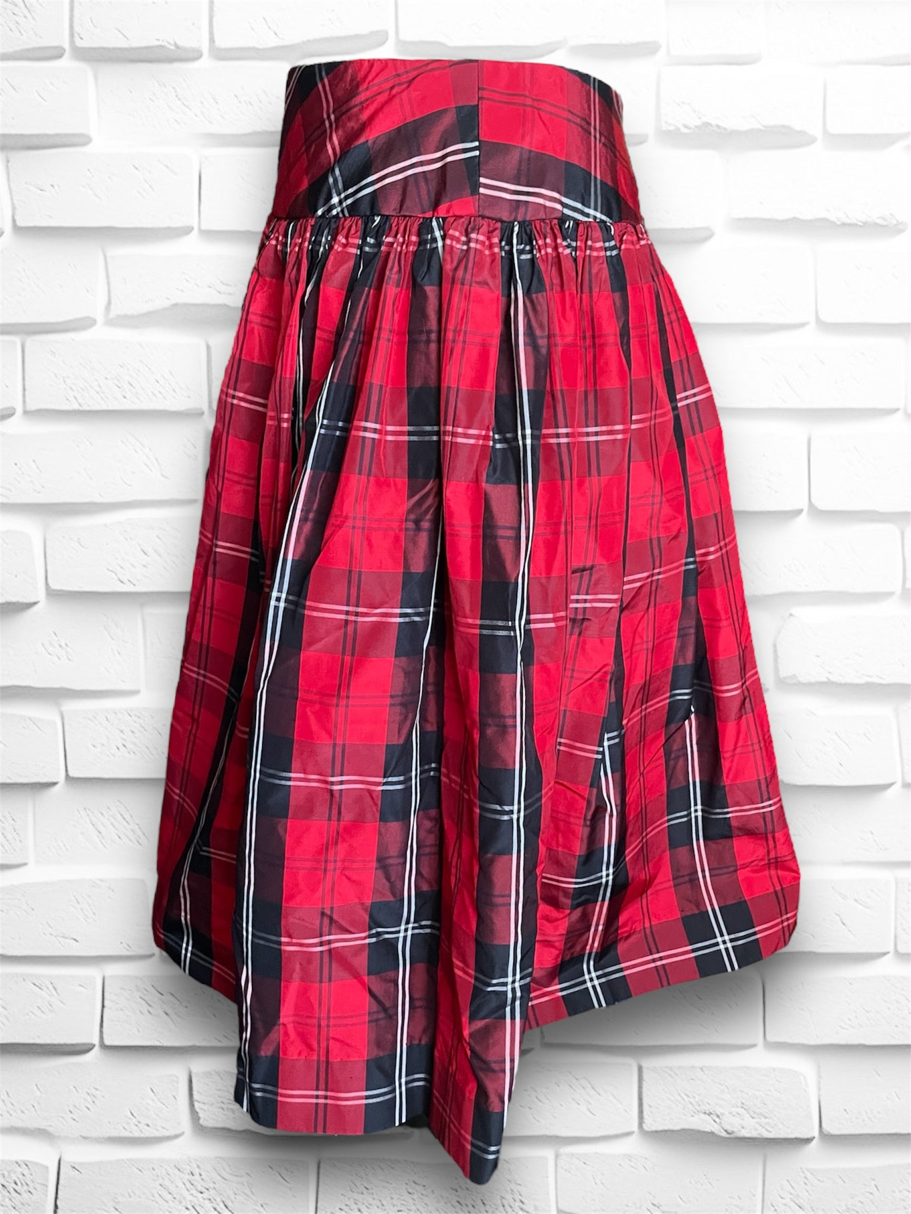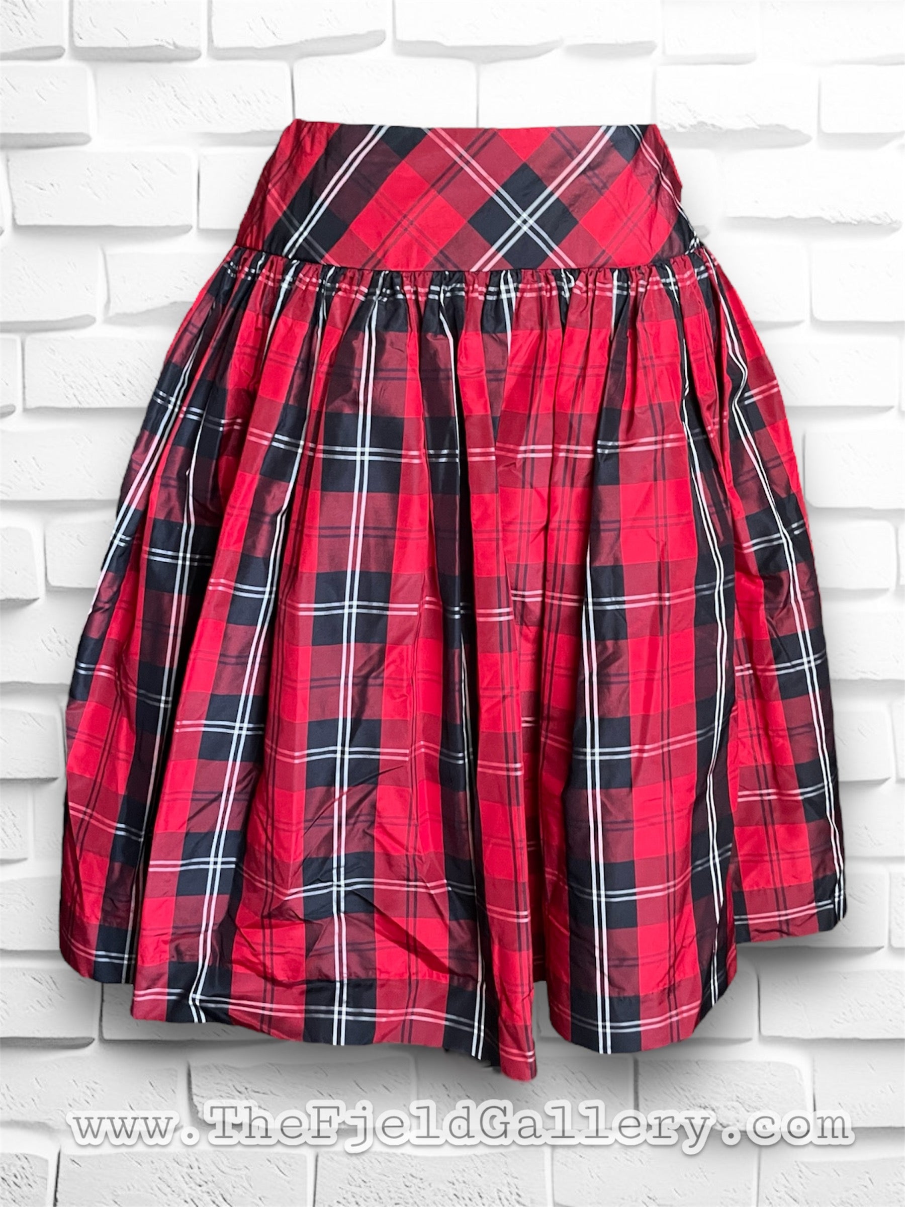 Super cute vintage red, black & white plaid holiday silk skirt. Hip hugging band with a full mid calf ballooning skirt. Tags read “ILGWU Union Made in the USA / Size 8 / 100% Silk” This Label was used from 1974-1995. Perfect condition.