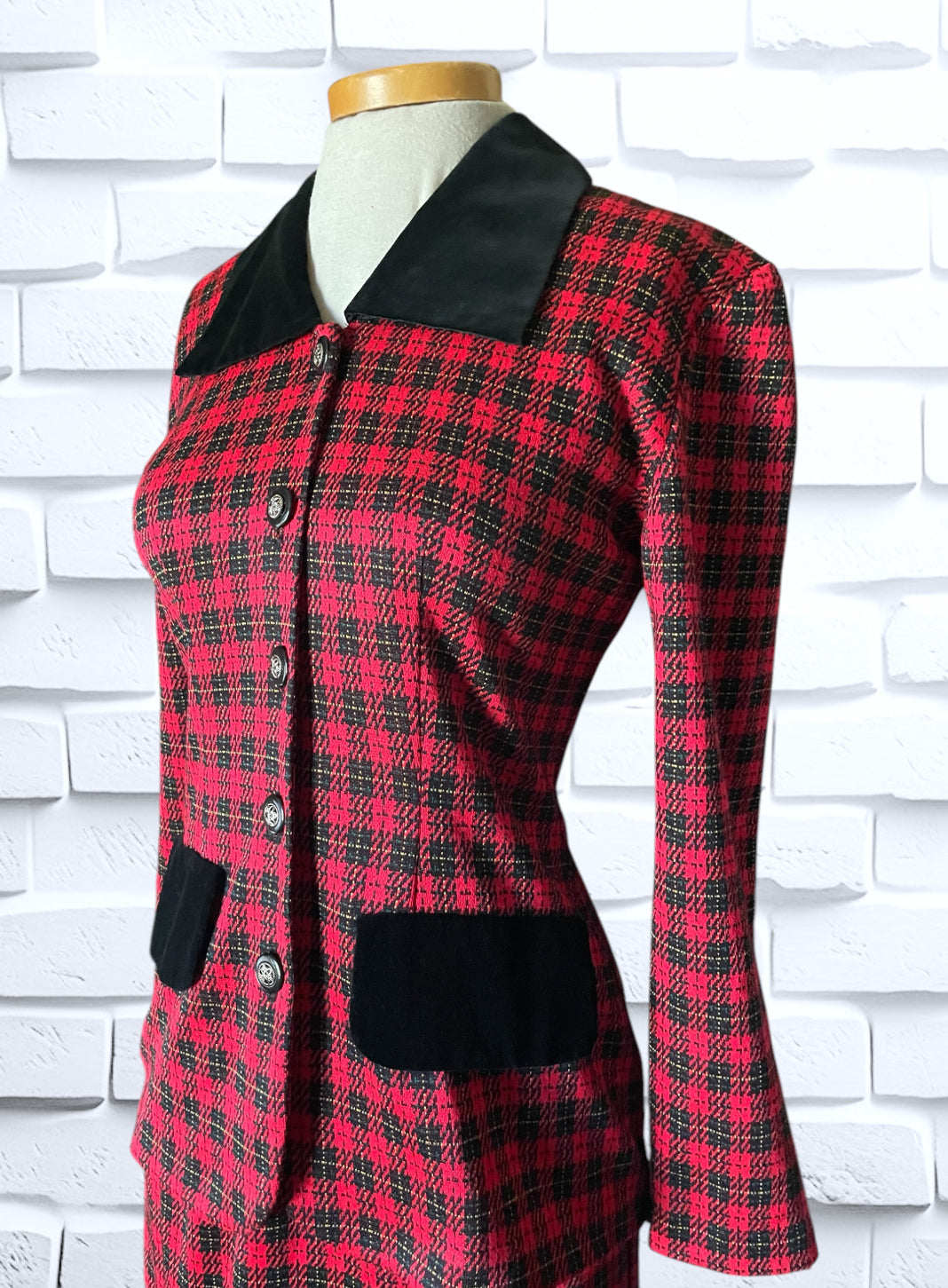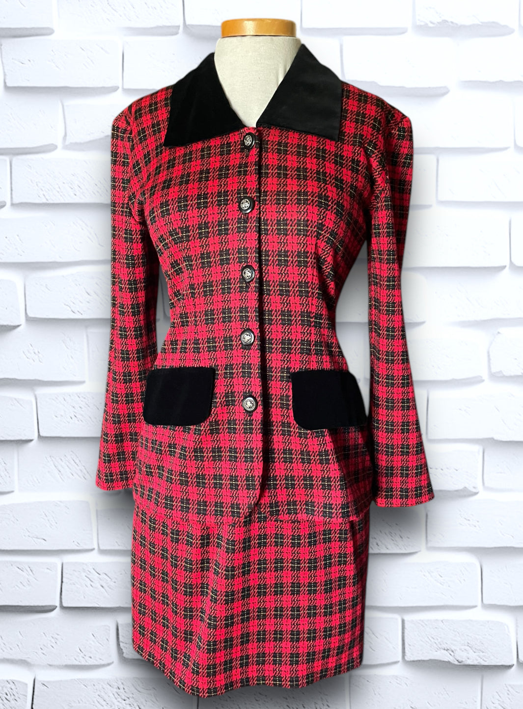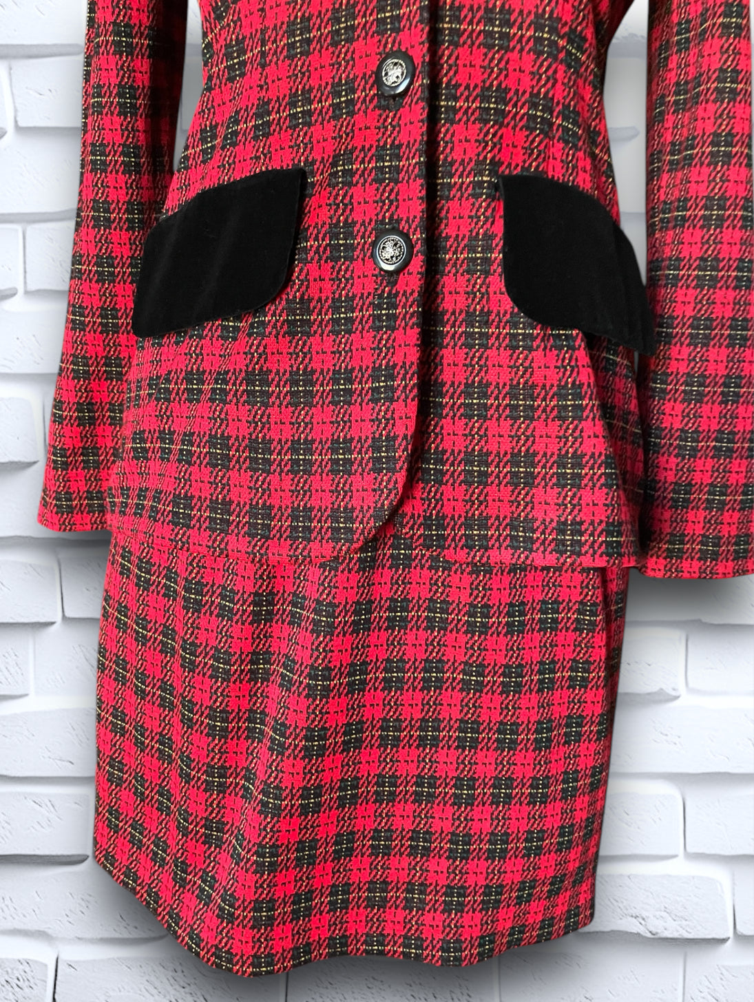 Vintage Red, Black & Yellow Plaid Skirt Suit with Black Velvet Detailing