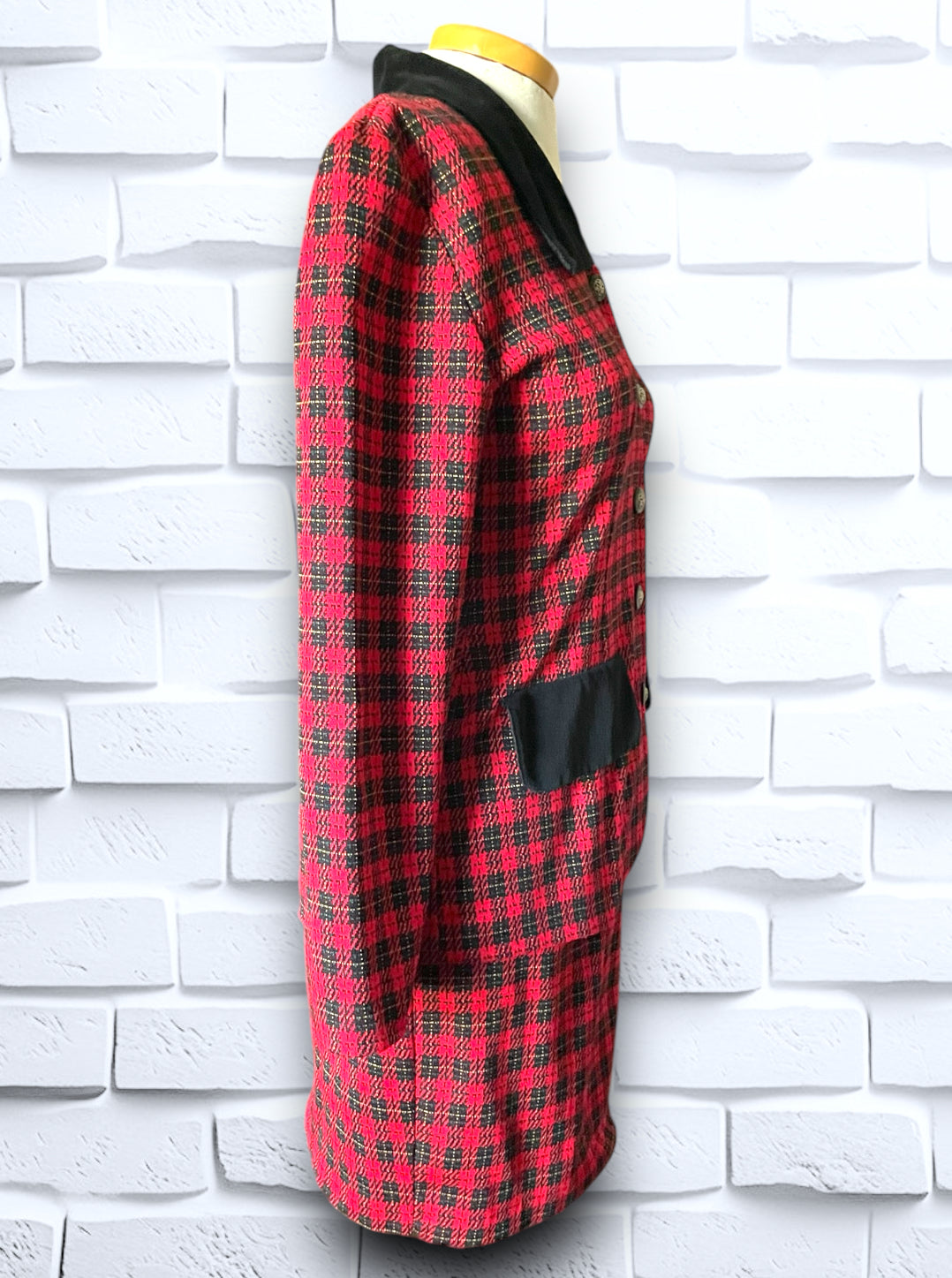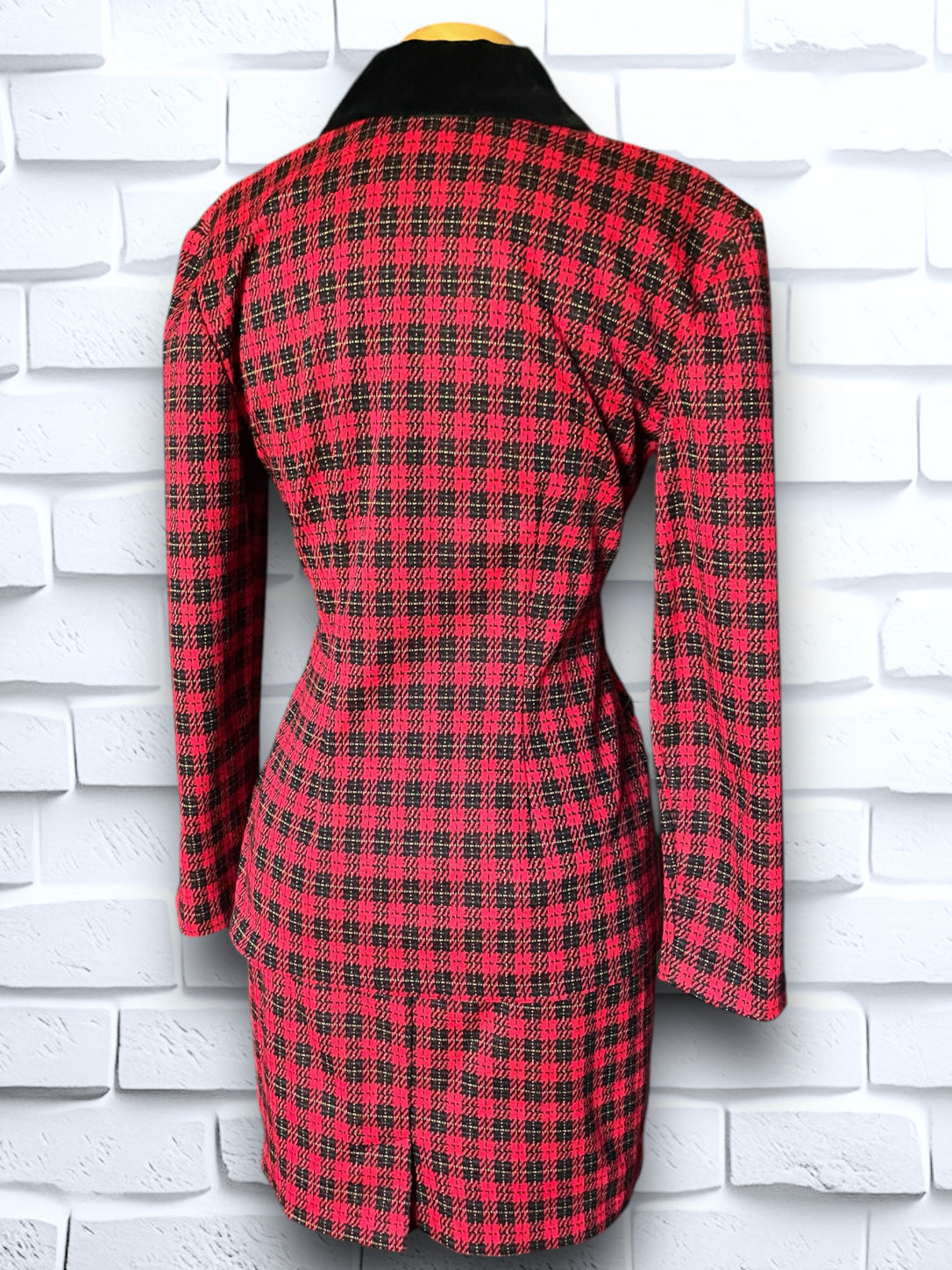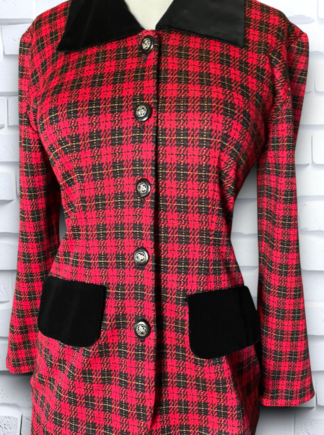 Vintage Red, Black & Yellow Plaid Skirt Suit with Black Velvet Detailing