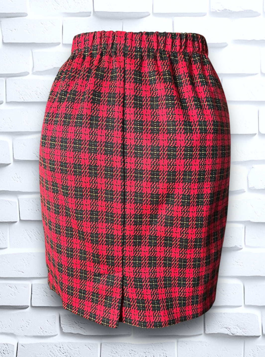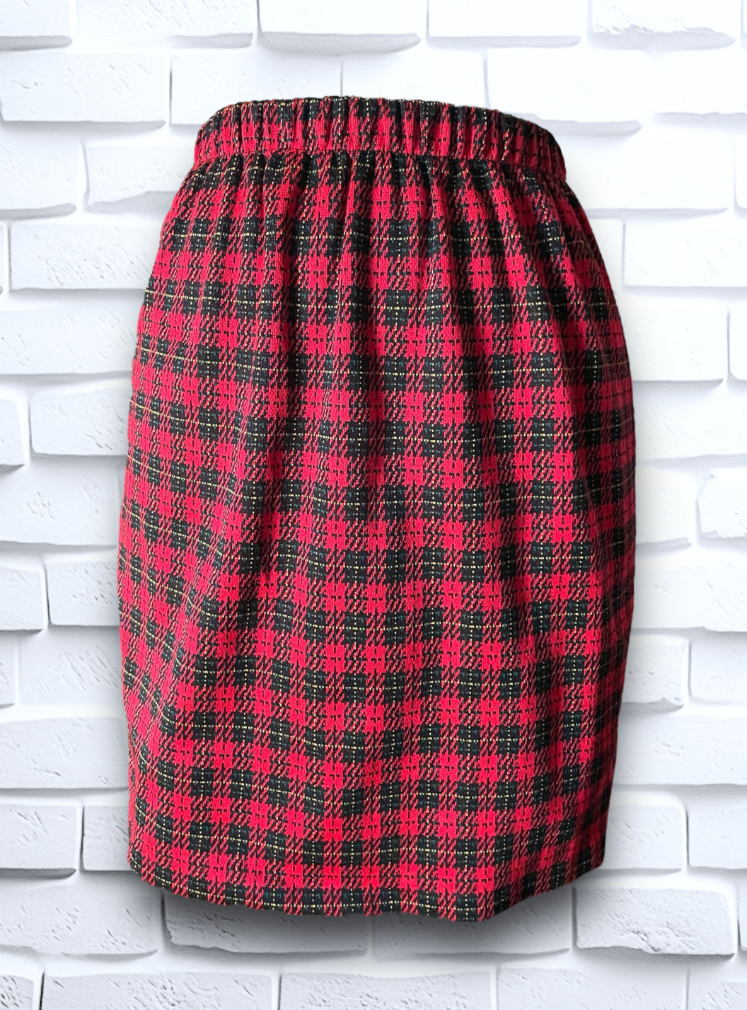 Amazing vintage red, black, yellow & green plaid holiday skirt suit with a black velvet collar and front pocket flap detail.  Has 5 black and gold regal buttons up the front of the top and an elastic waist pencil mini skirt with a slit in the back.  Tags have been removed so don’t know the designer or size.  But to me seems like a S/M, measurements below.