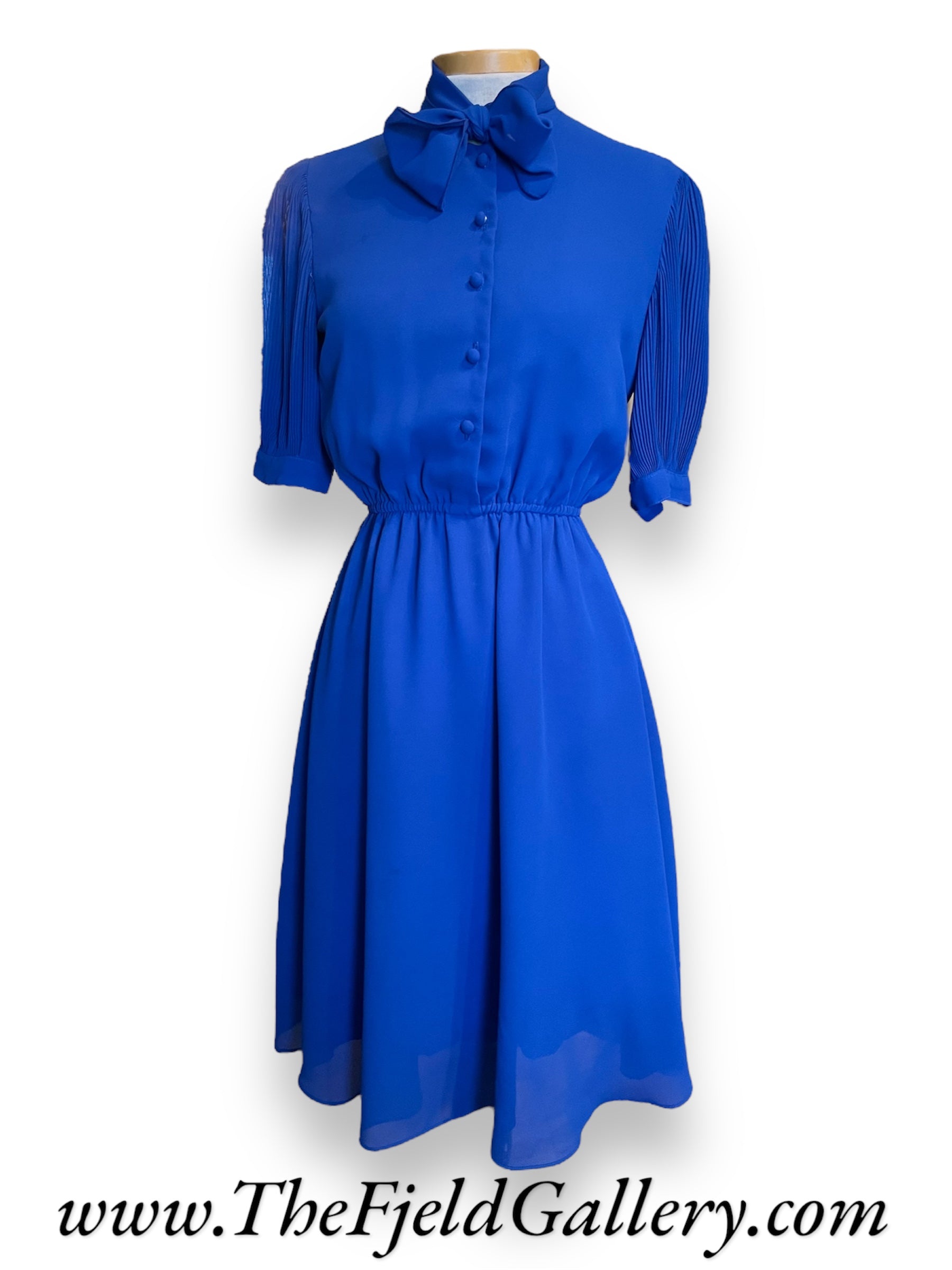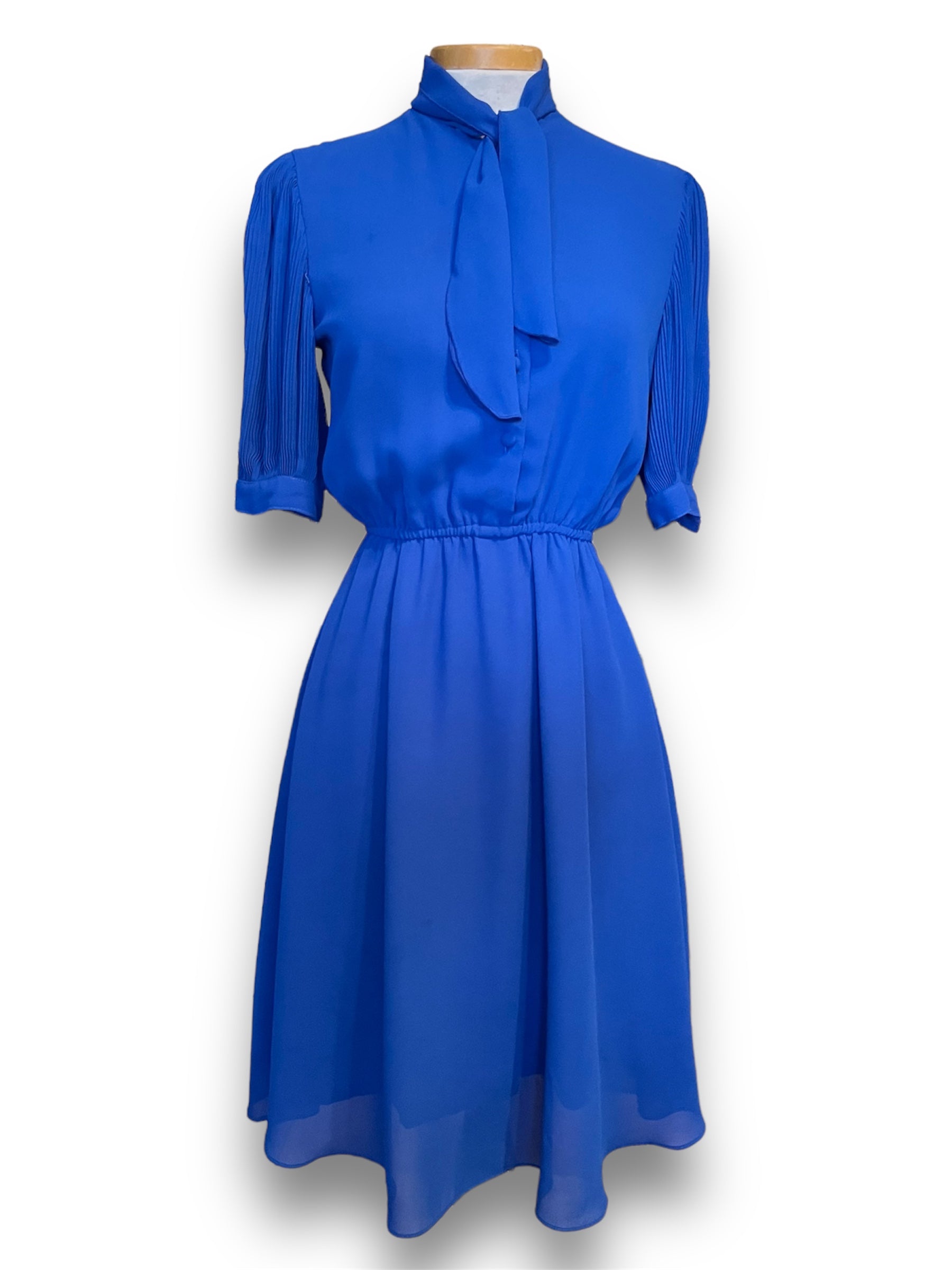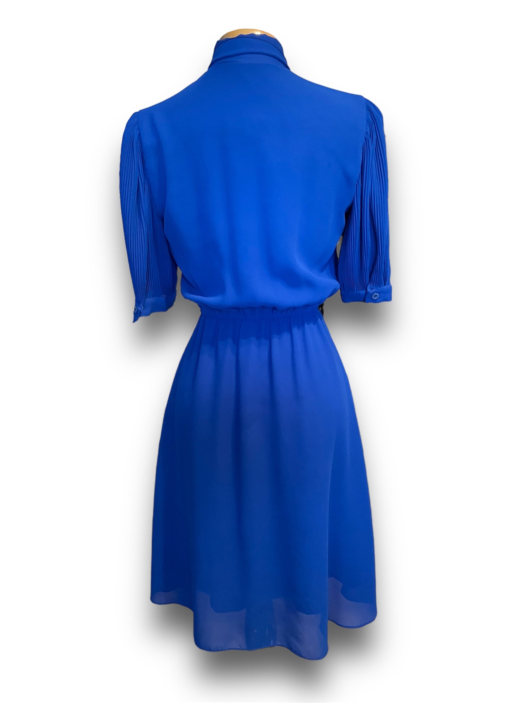 Beautiful Royal Blue Rafael Matz for Ferrati Petites (Net York, Miami, Paris, London) flowing elastic waist dress with pussy now neck and fabric covered buttons up the front and pleated sleeves with button detail. Amaxing condition, no damage anywhere. Tag says 9/10.