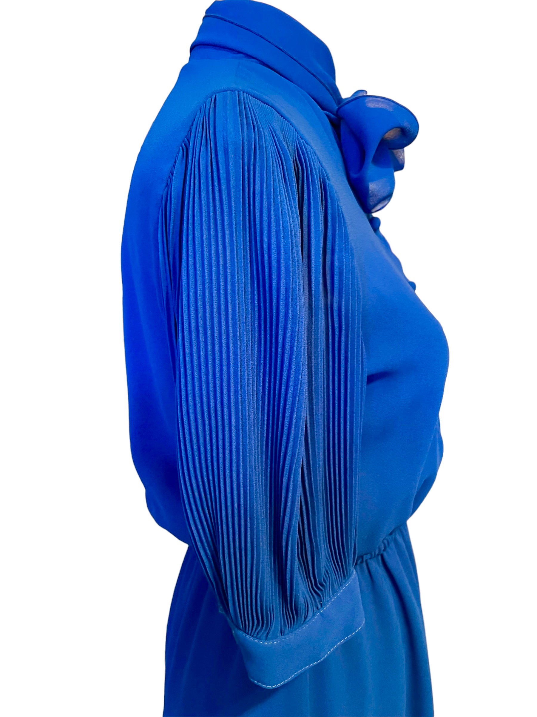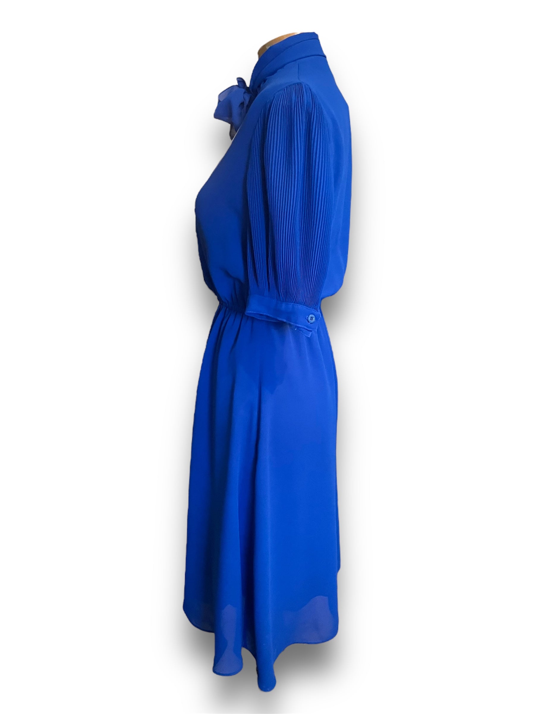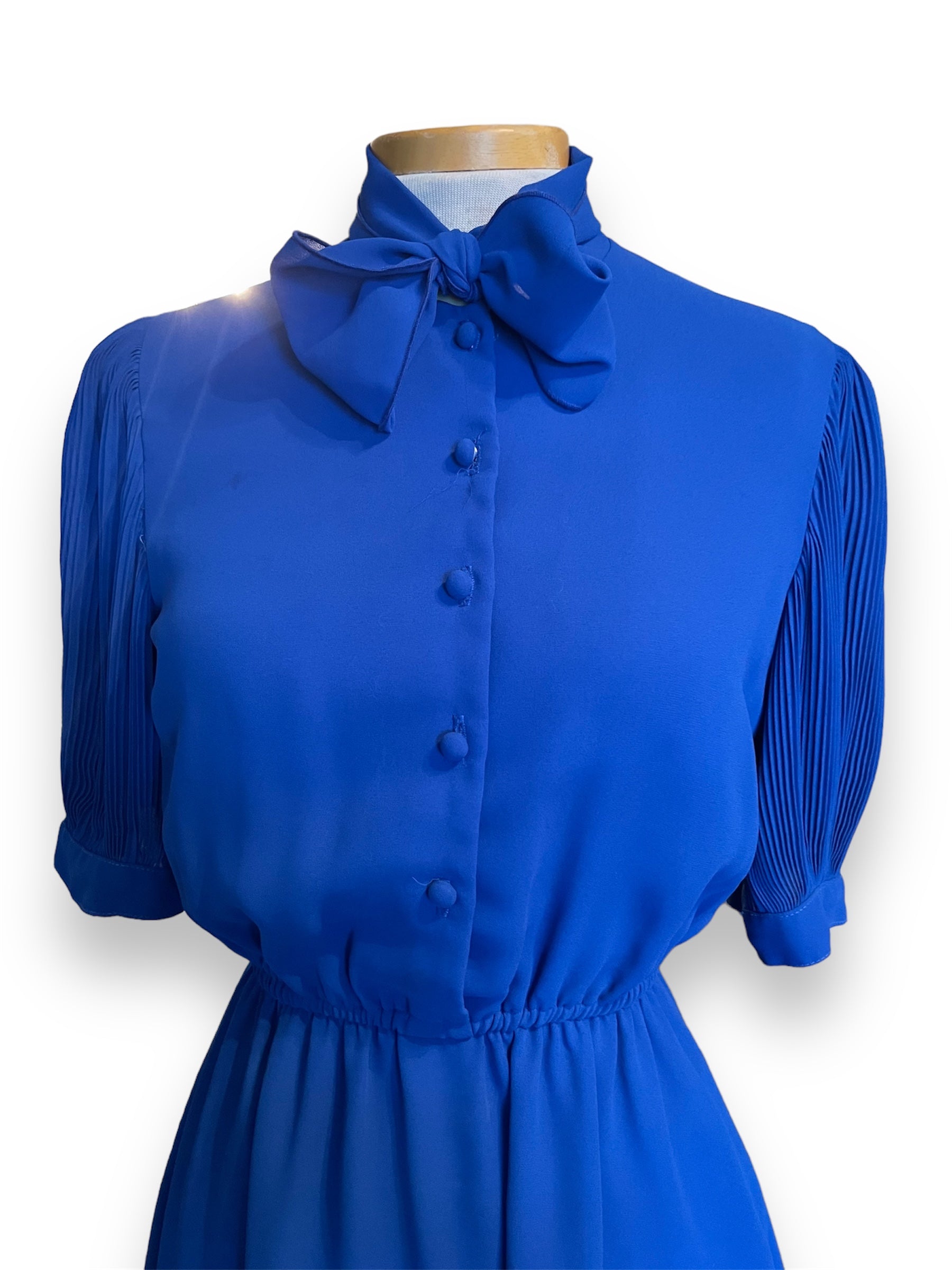 Beautiful Royal Blue Rafael Matz for Ferrati Petites (Net York, Miami, Paris, London) flowing elastic waist dress with pussy now neck and fabric covered buttons up the front and pleated sleeves with button detail. Amaxing condition, no damage anywhere. Tag says 9/10.
