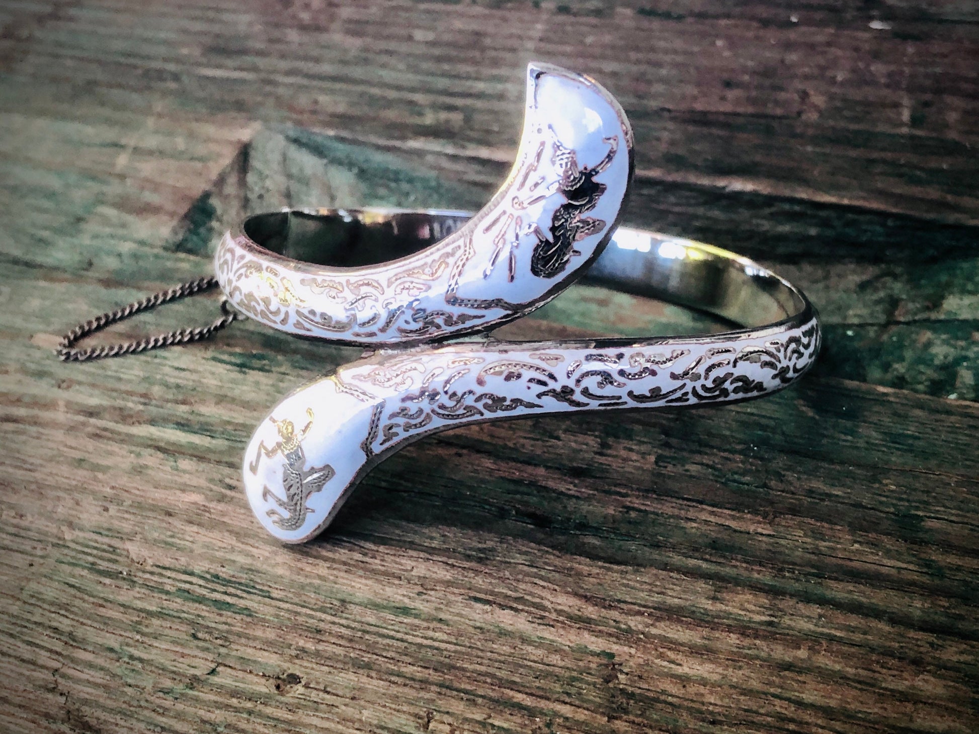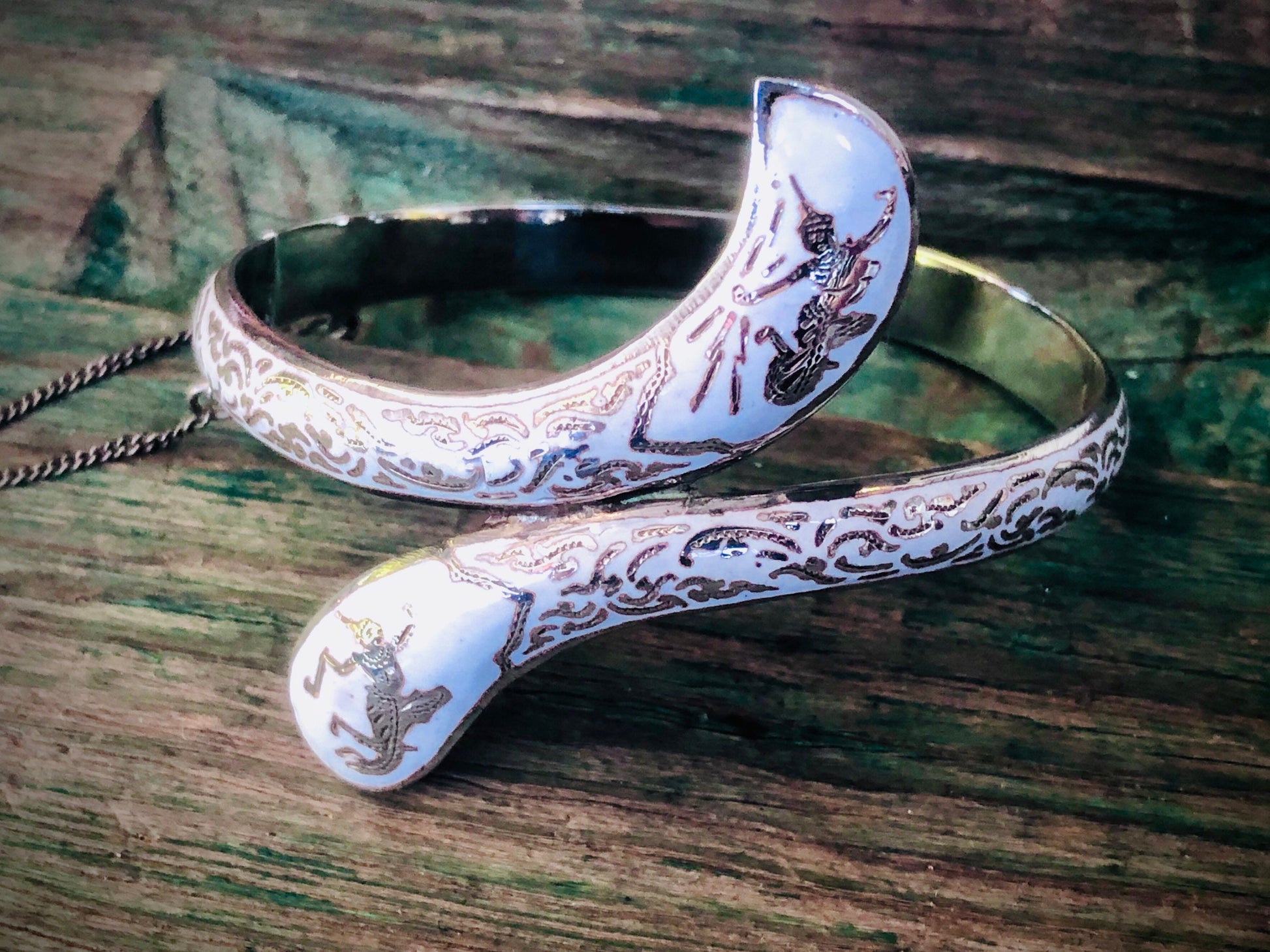 Vintage Siam Sterling Silver White Enamel Mekkalah & Ramasoon Hindu Gods and Goddess Lightning and Thunder Hinged Bangle Bracelet