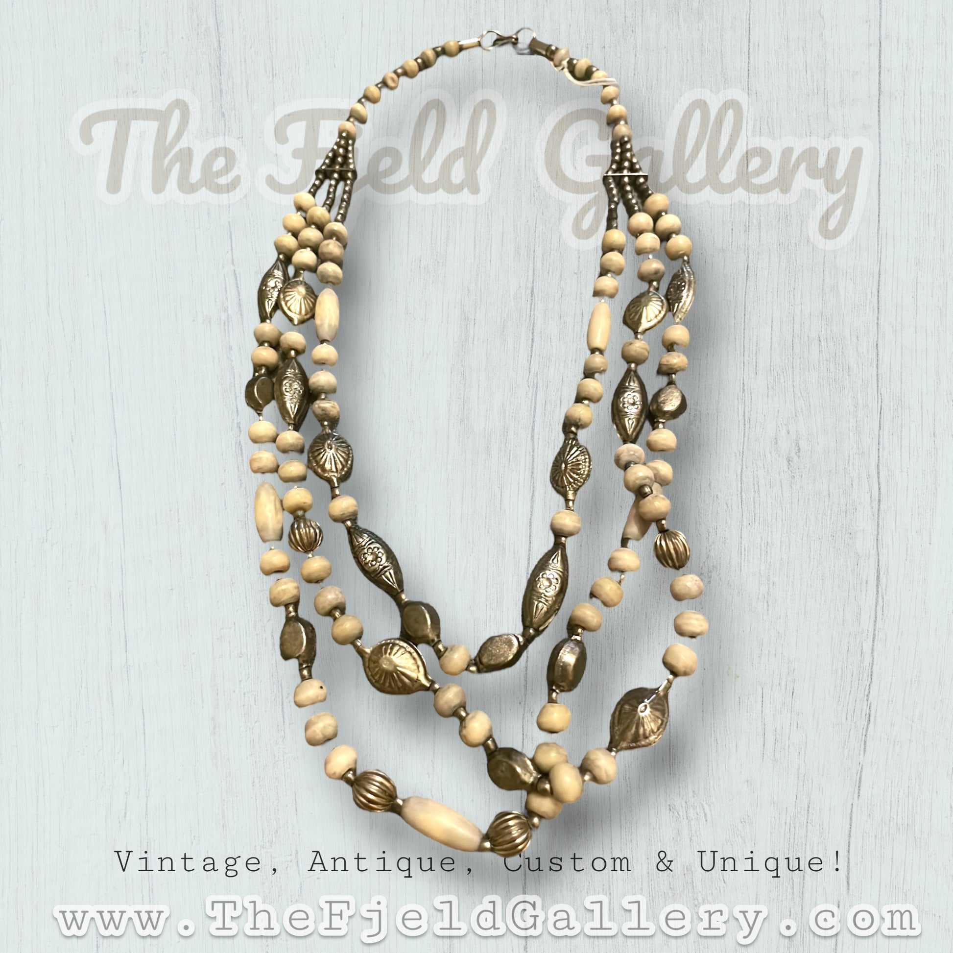 Vintage Silver Flower Embossed & White Bone Beaded Multi Strand Necklace