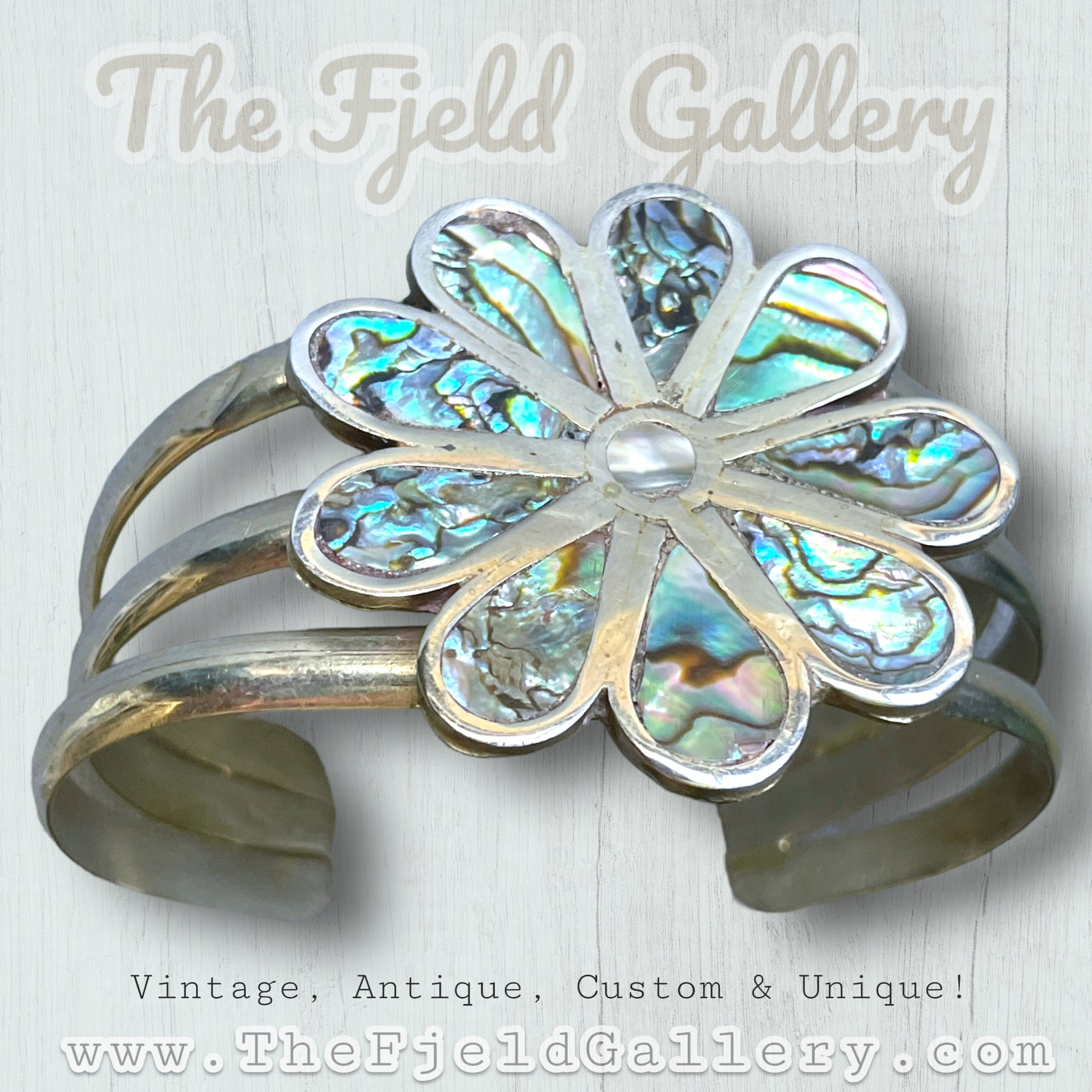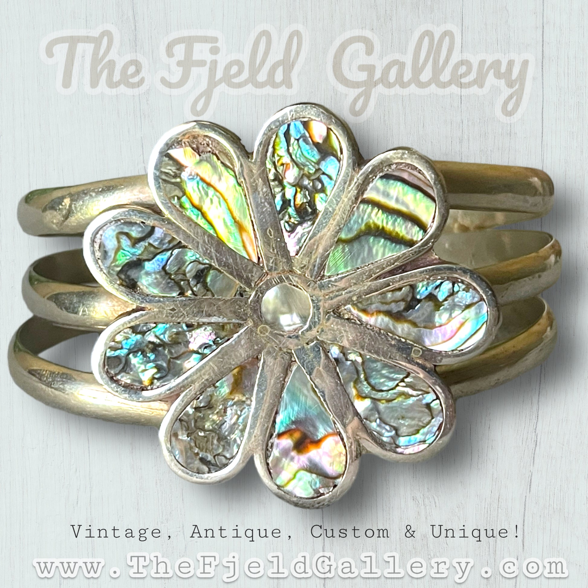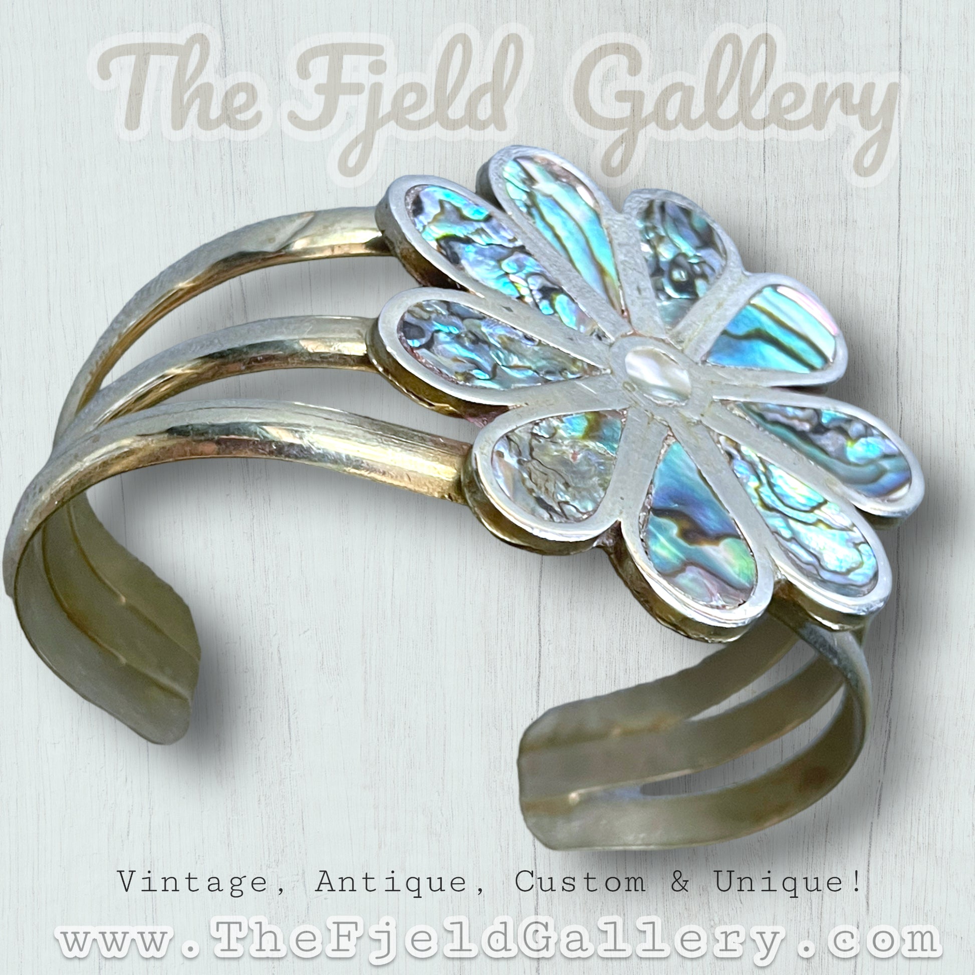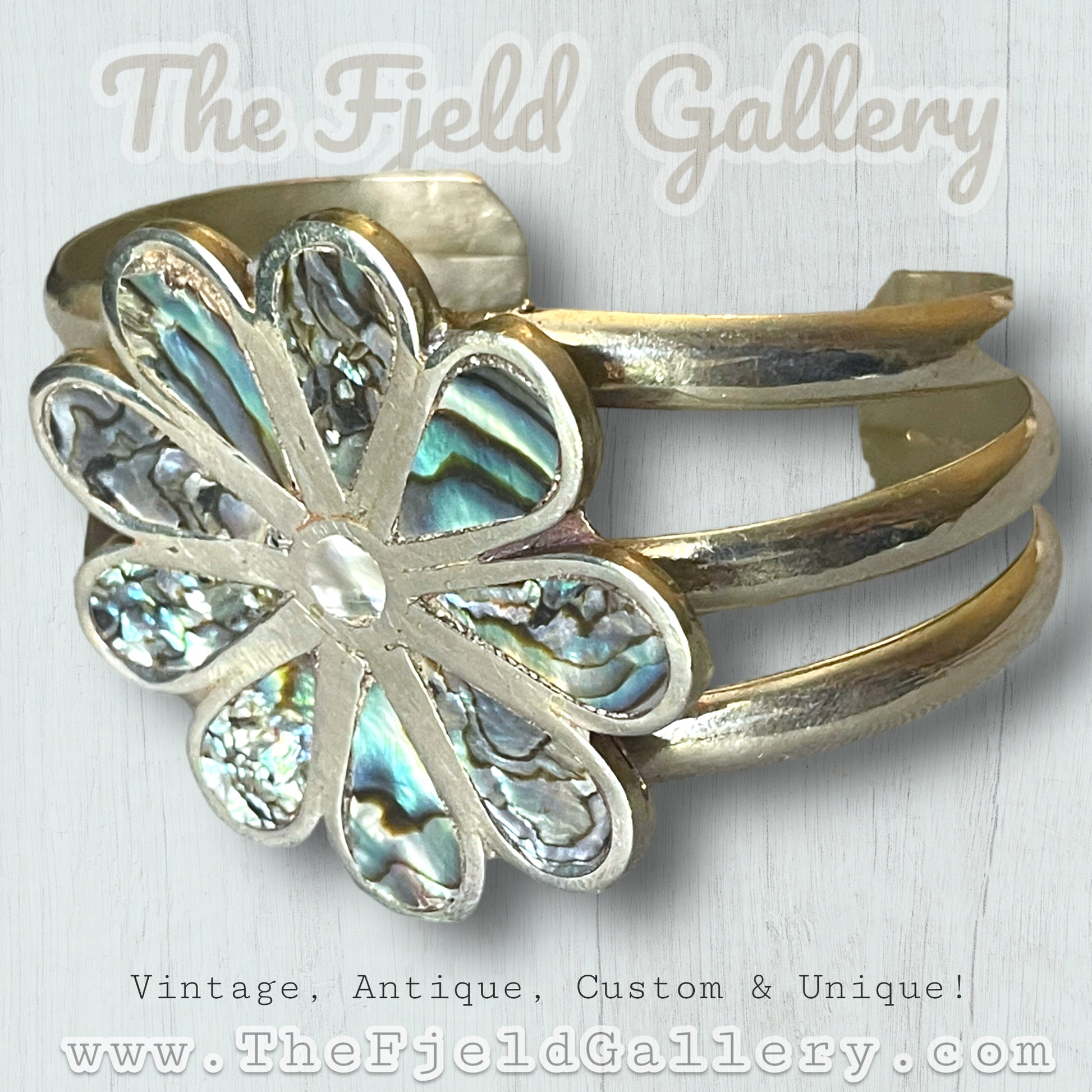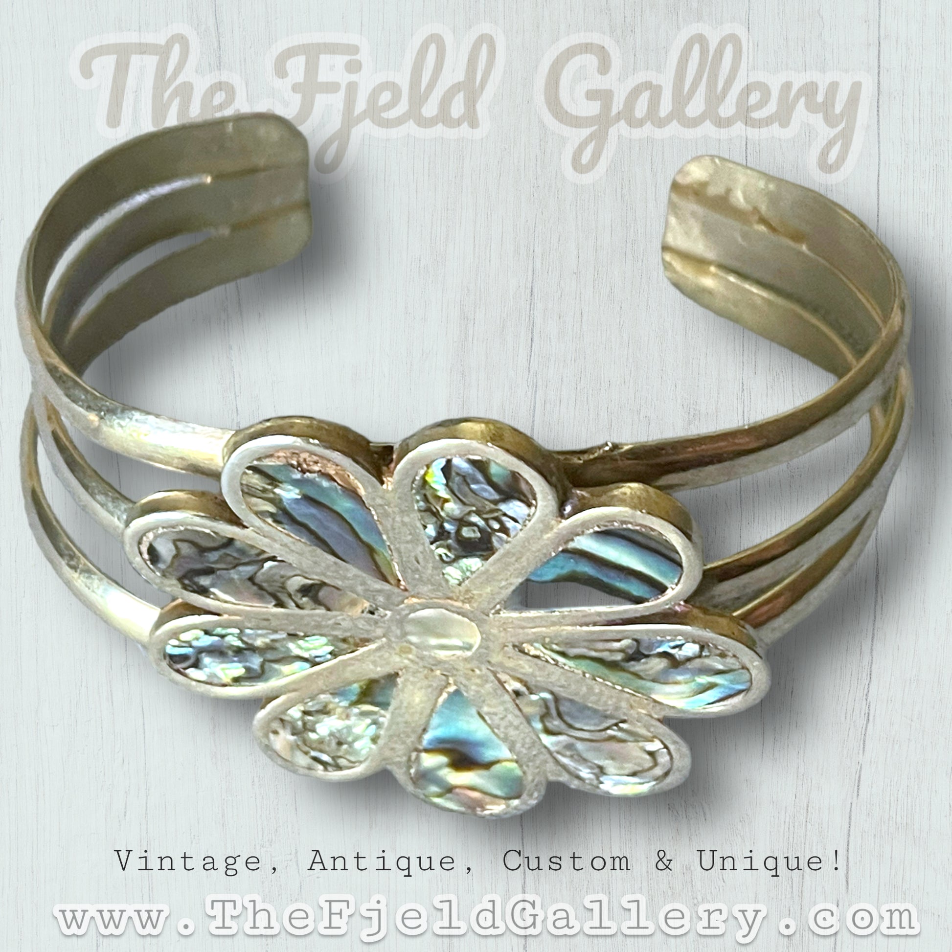 Vintage Sterling Silver Abalone Daisy Flower Cuff Bracelet