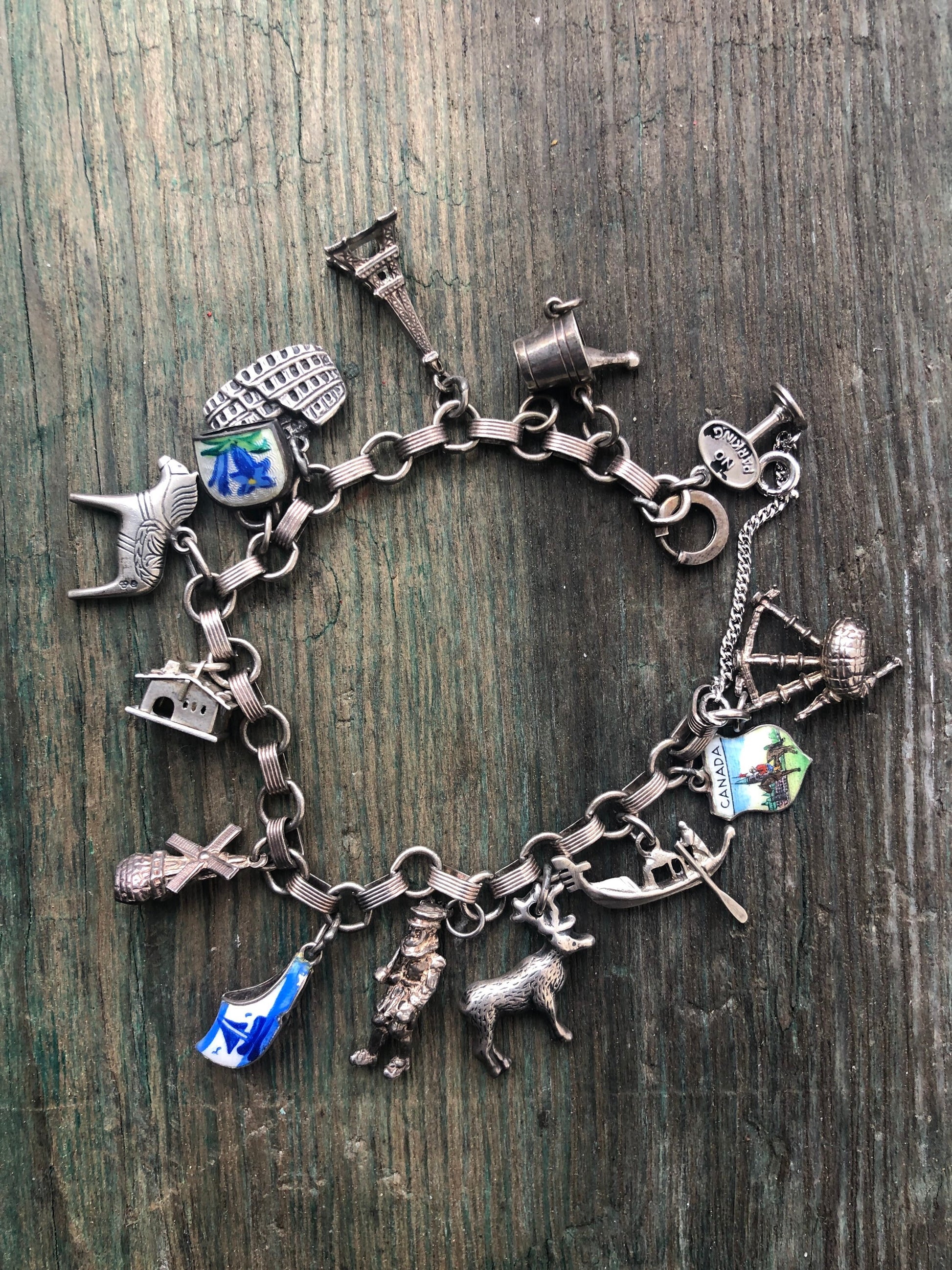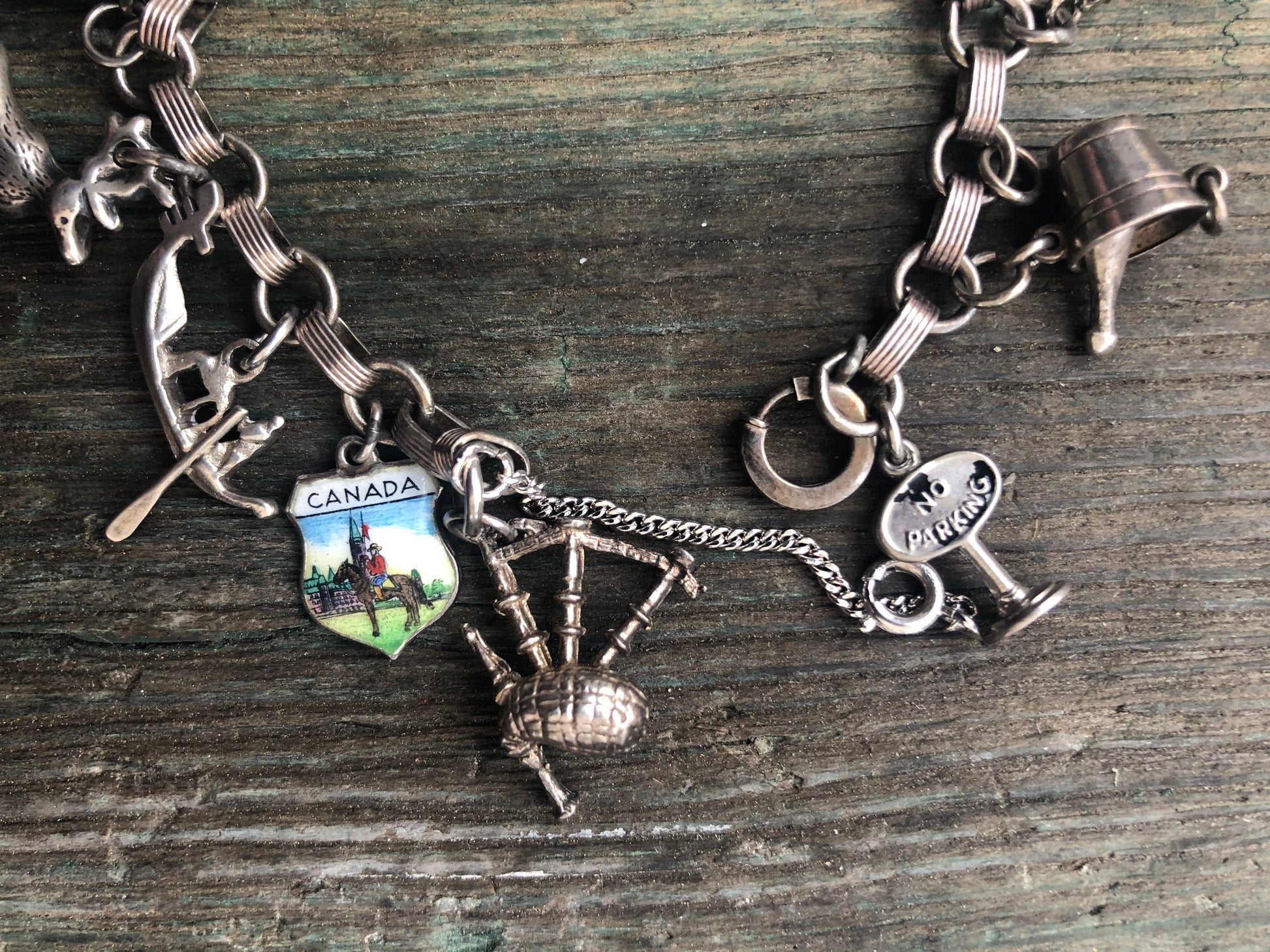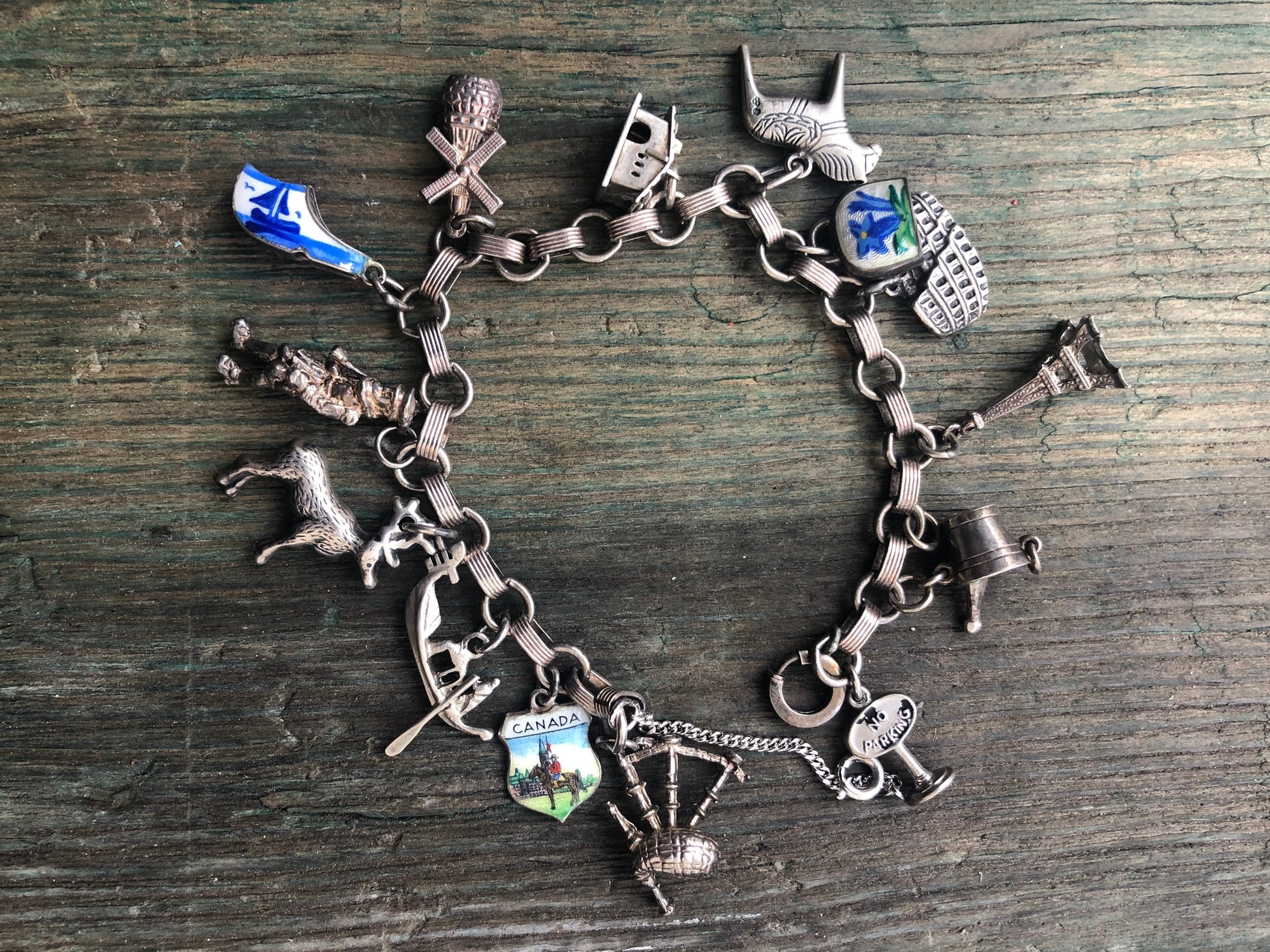 Vintage Sterling Silver Charm Bracelet with Windmill, Reindeer, Eiffel Tower, Bagpipes, Dutch Enamel Shoe, Champagne, Cabin & More