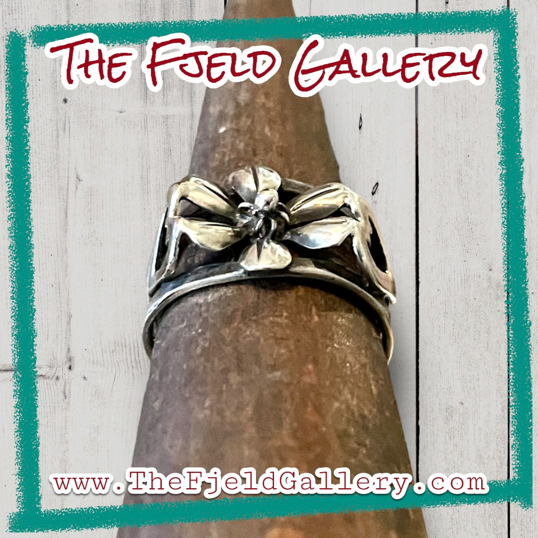 Beautiful cast sterling silver daisy flower ring with open hearts on either side of the band.