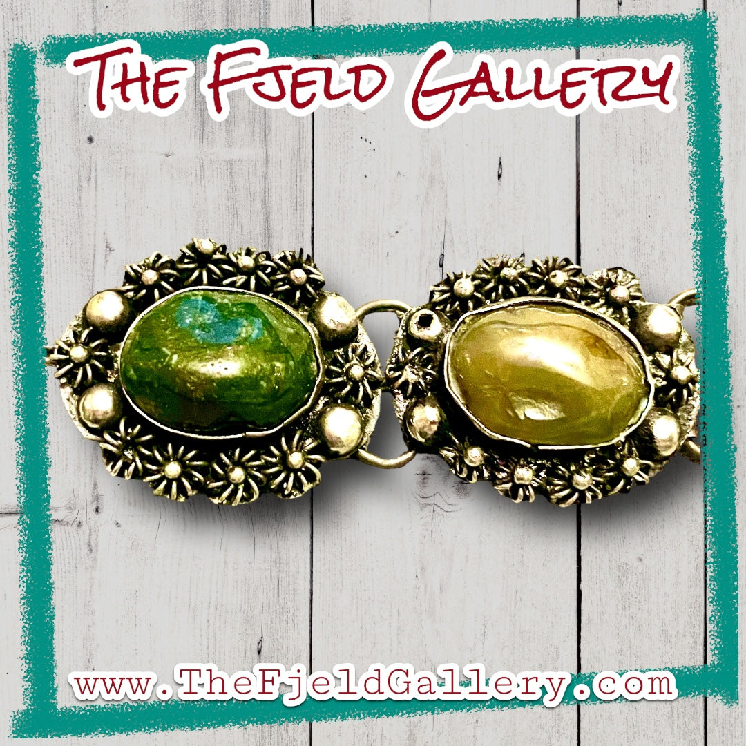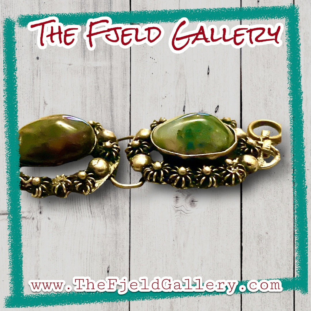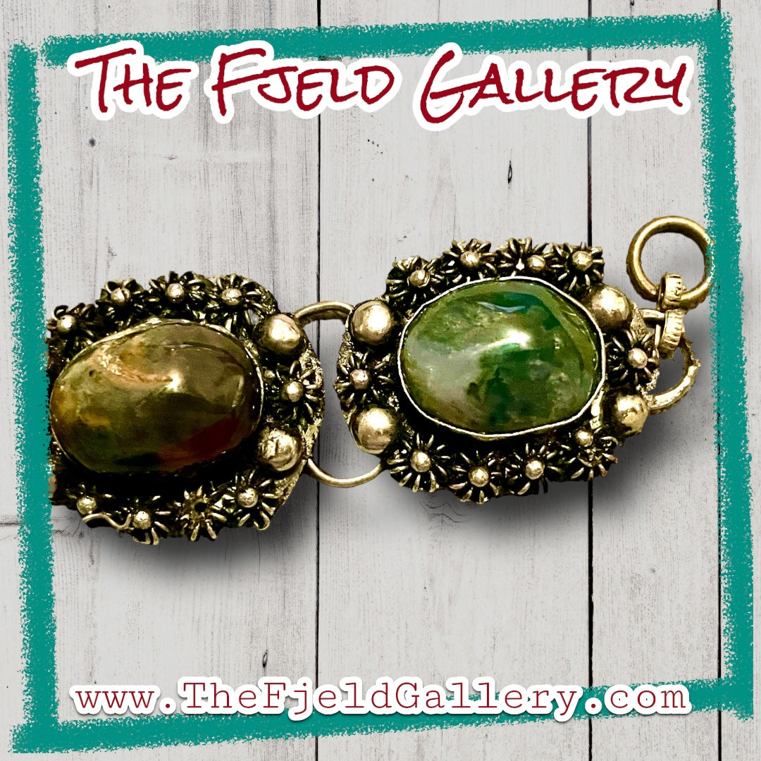 Gorgeous multi gemstone agate and jasper bezel set sterling silver panel bracelet. There are 5 green, blue and red colored jasper and agate gemstones measuring 23mm x 15mm each. each gemstone is surrounded by 10 flowers and 4 raindrops details. Hook style clasp/closure. No hallmarks or signatures are visible. full bracelet measures 7.5” long and 1” wide.