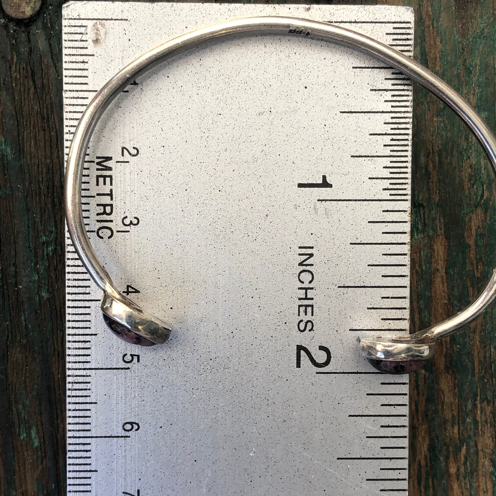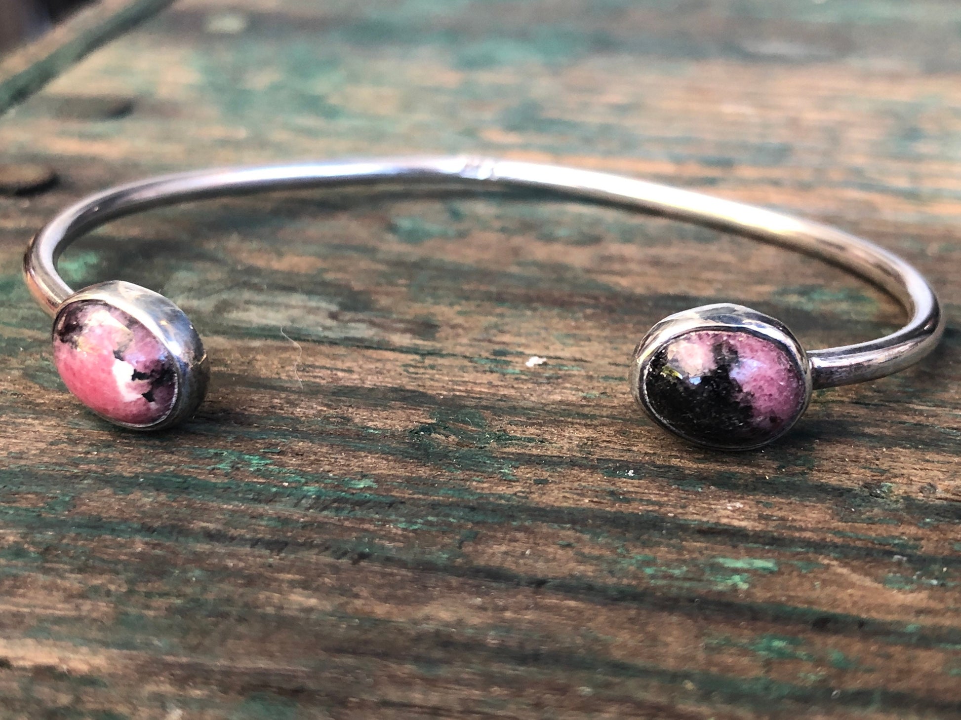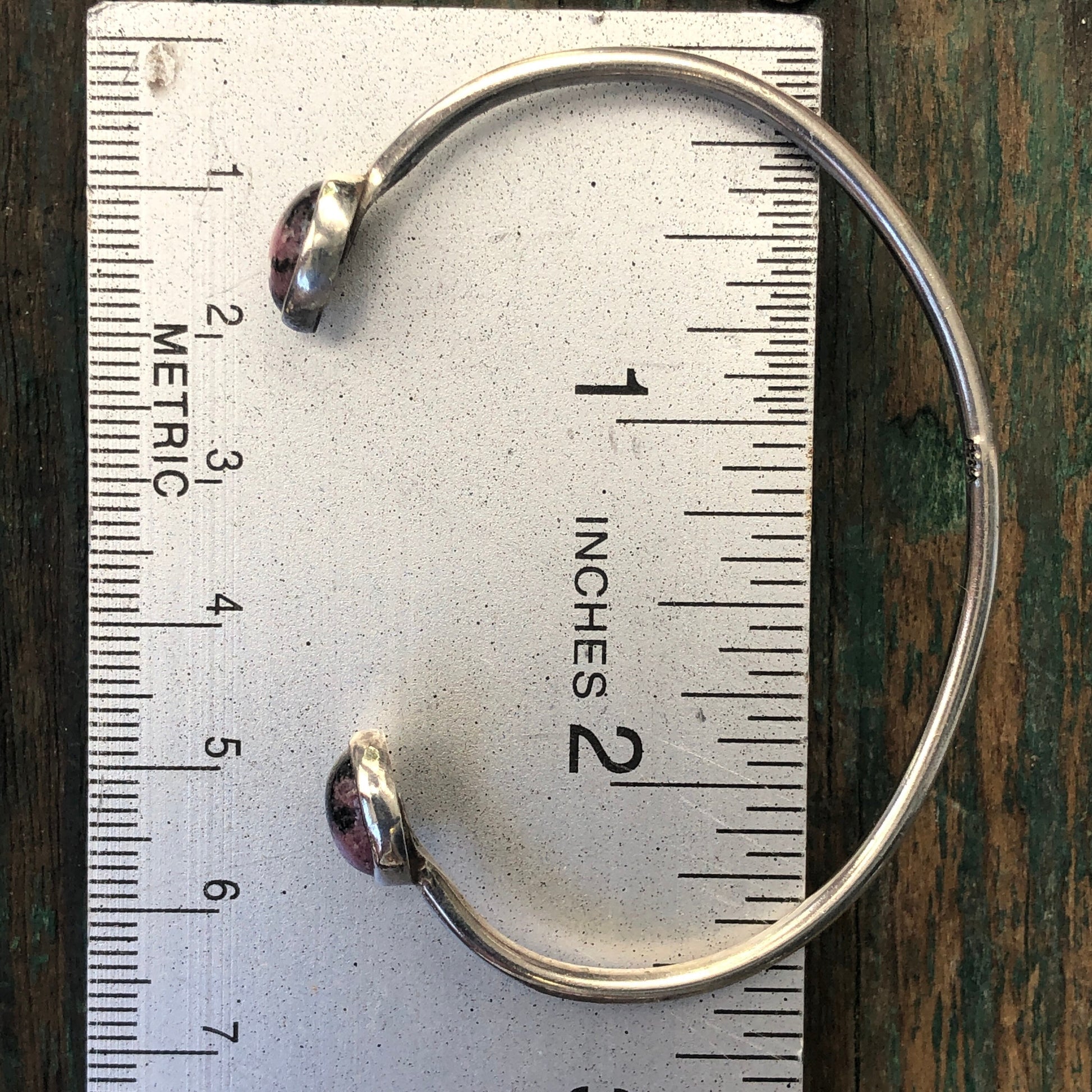 Vintage Sterling Silver Pink & Black Rhodonite Gemstone Reverse Cuff Bracelet. Stamped 925. Round Sterling Wire Cuff Shank and 2 10x8mm bezel set rhodochrosite pink gemstones.