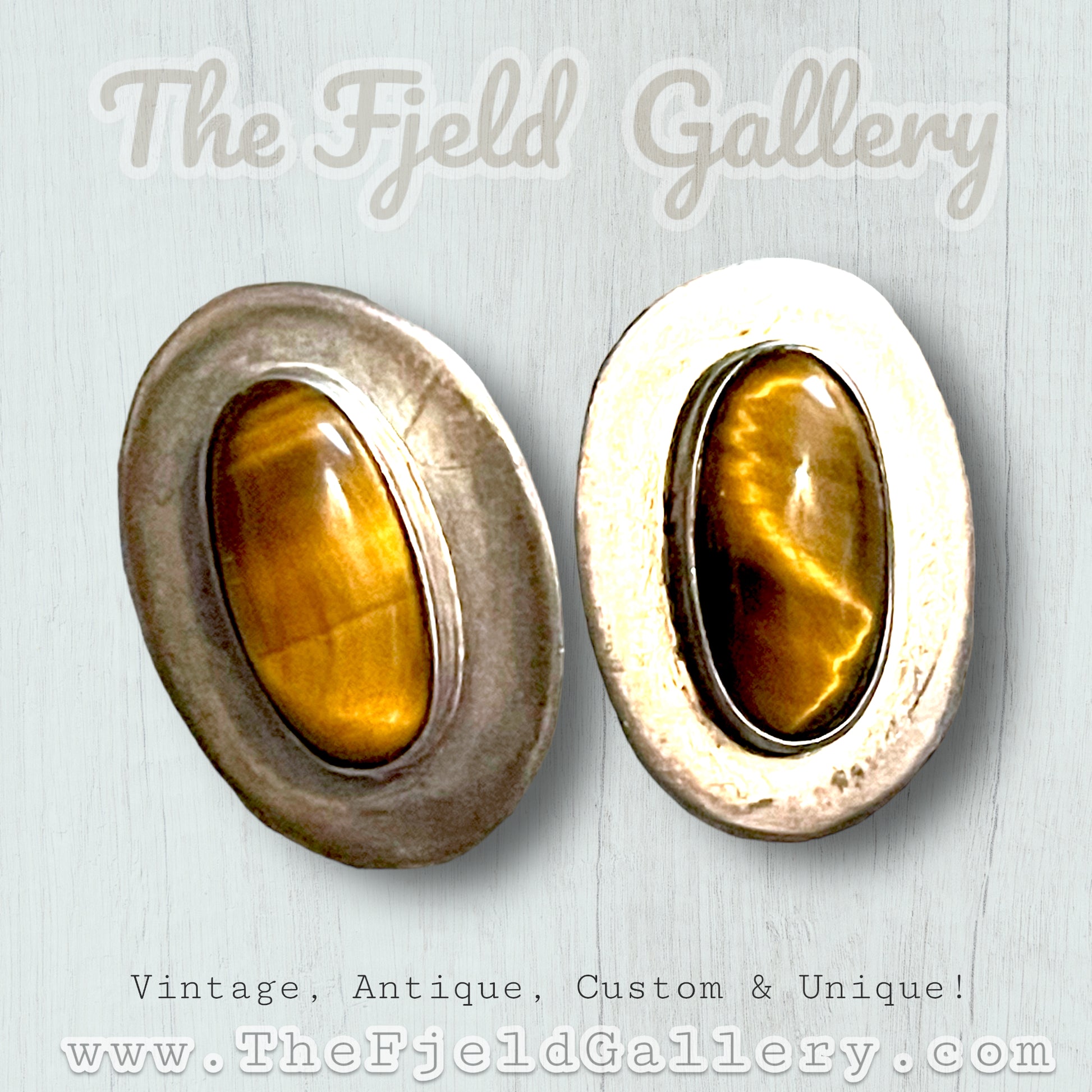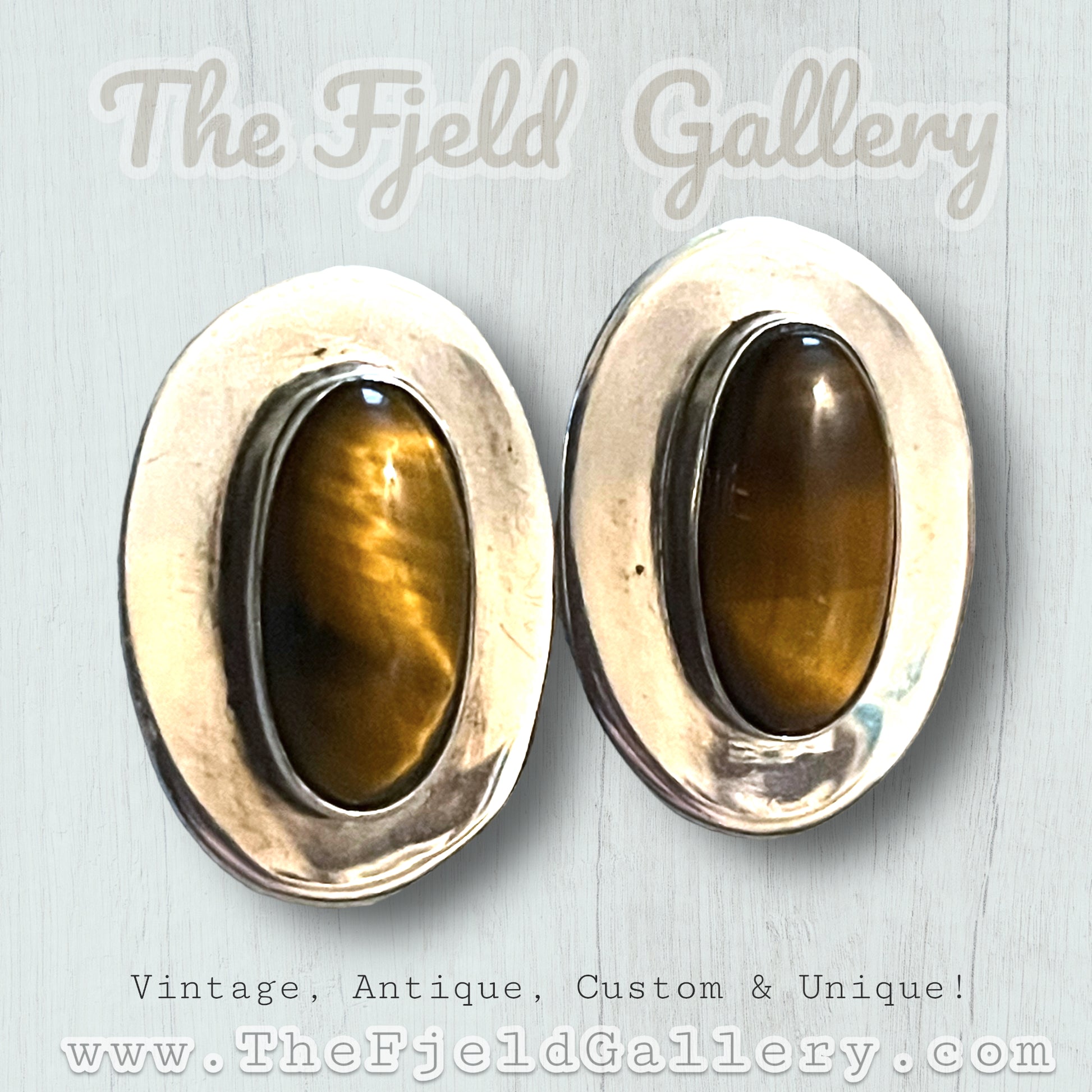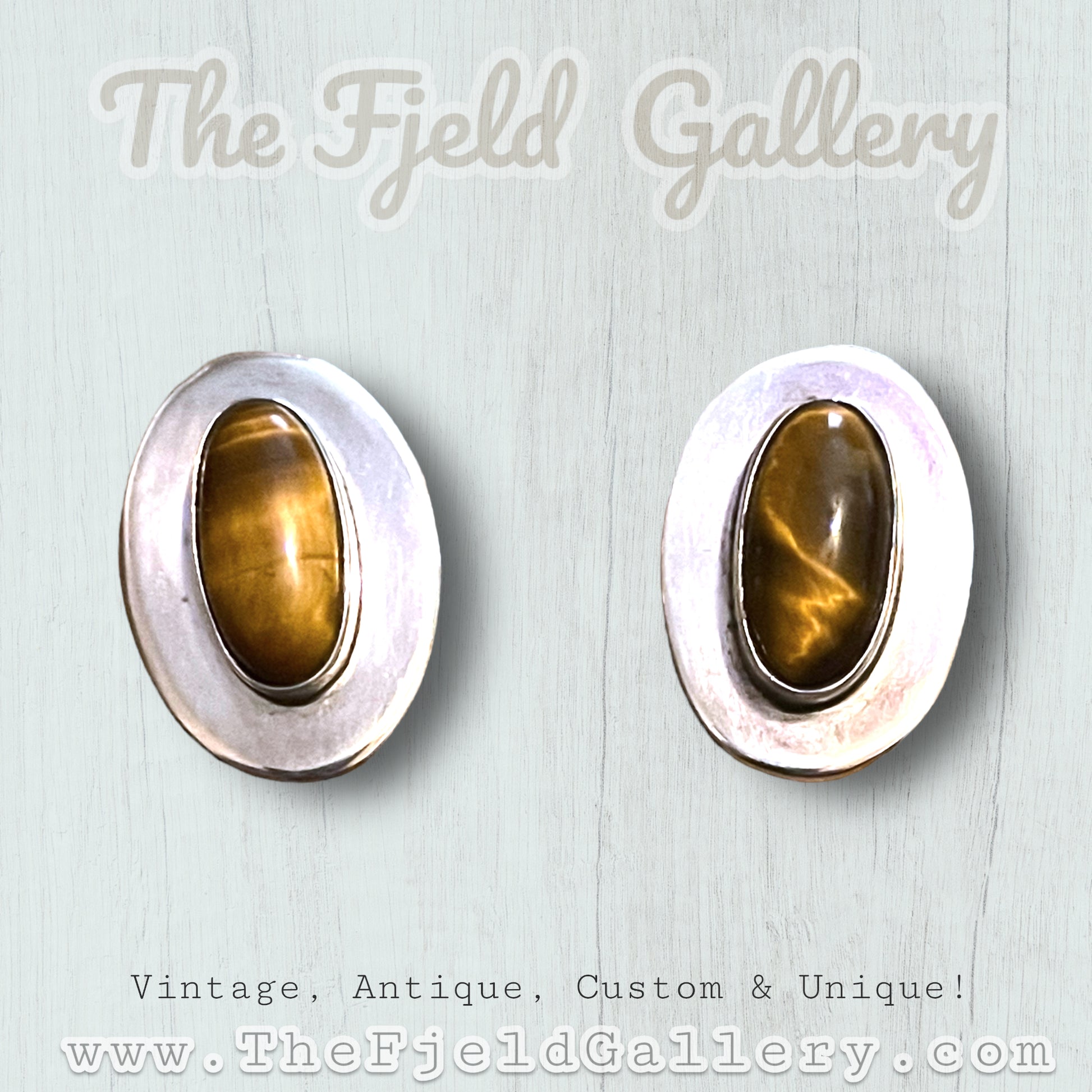 Beautiful bezel set tigers eye gemstone cabochons in sterling silver. Hallmarked on back 925 MEXICO SOMERSET / IONE TISSOT