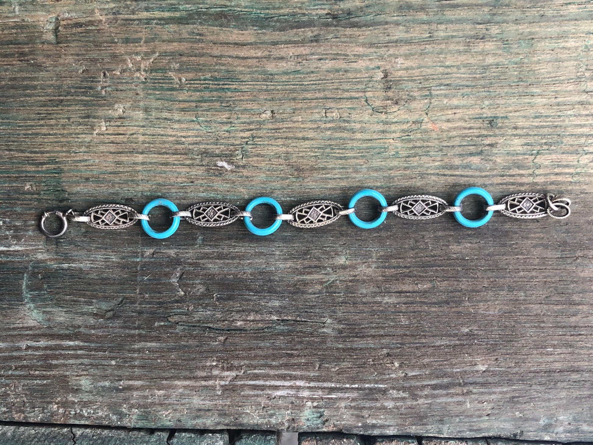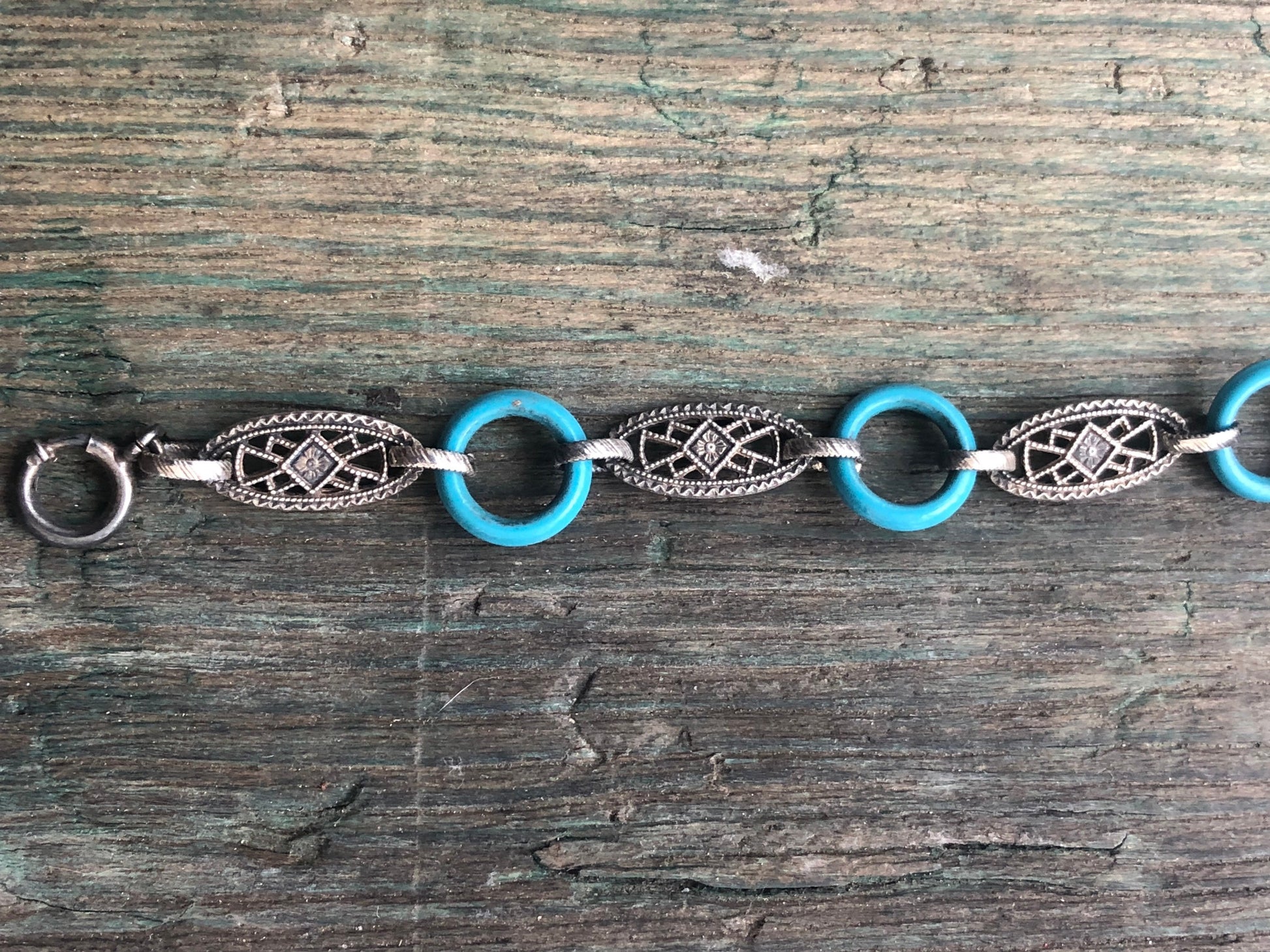 Vintage Sterling Silver & Turquoise Early Plastic O Loops Bracelet