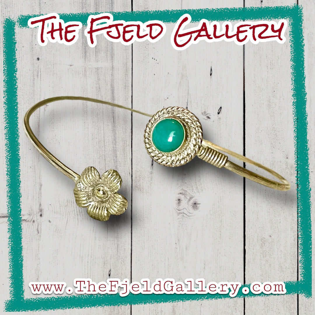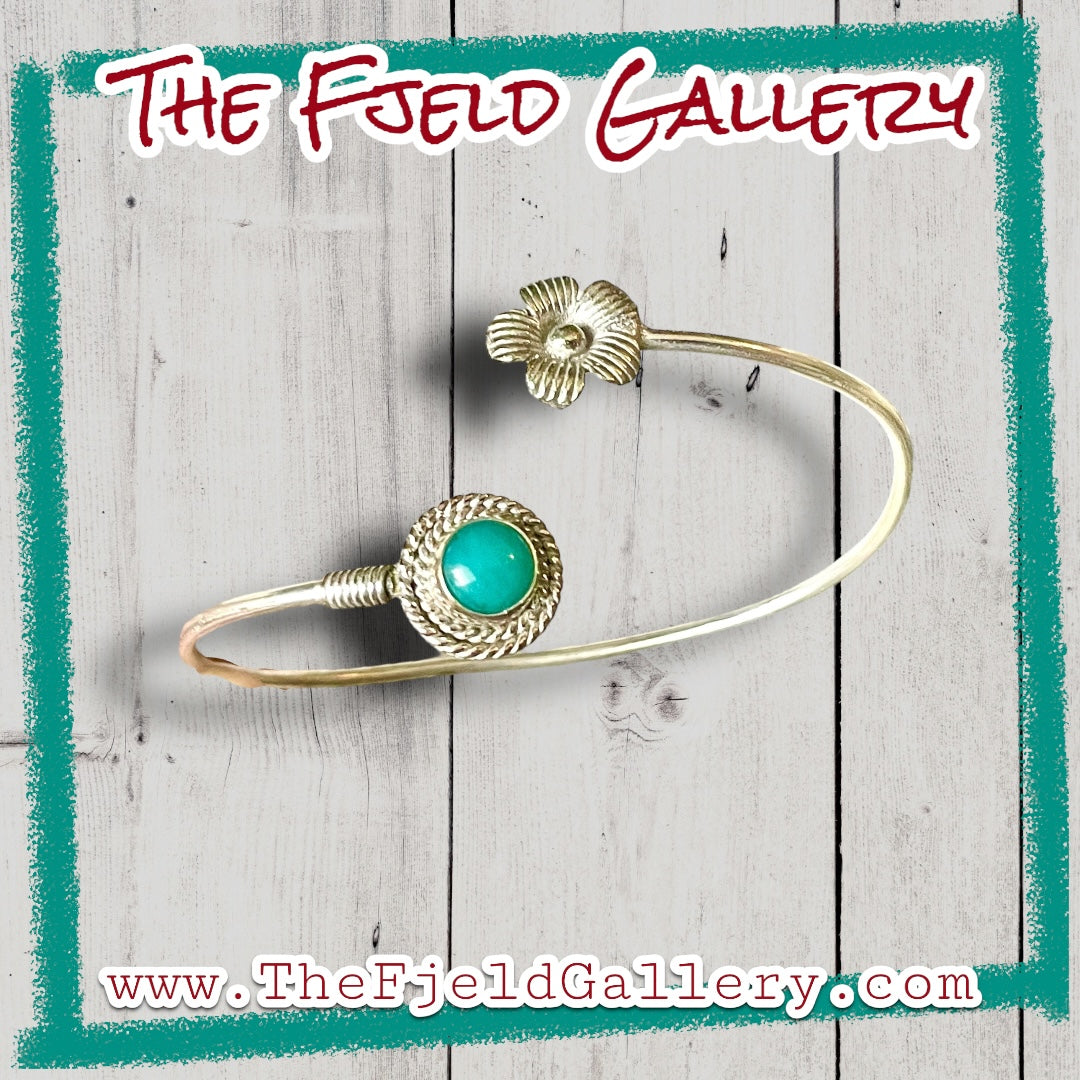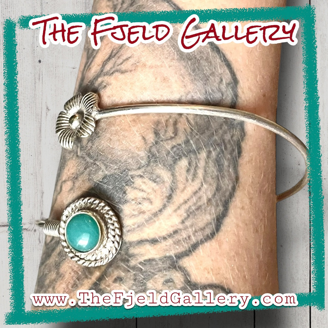 Beautiful vintage sterling silver bypass style bracelet with a bezel set turquoise gemstone on one side and a daisy flower on the other with a round wire band.