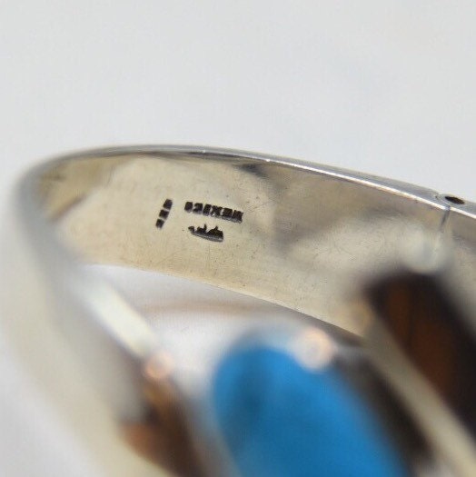 Beautiful blue turquoise with black matrix bezel set in a heavy cast sterling silver Mexican clamper bracelet. Hallmark 925 Mexico and maker mark.