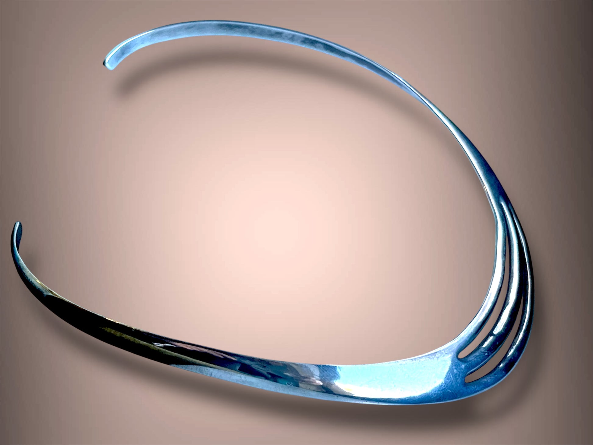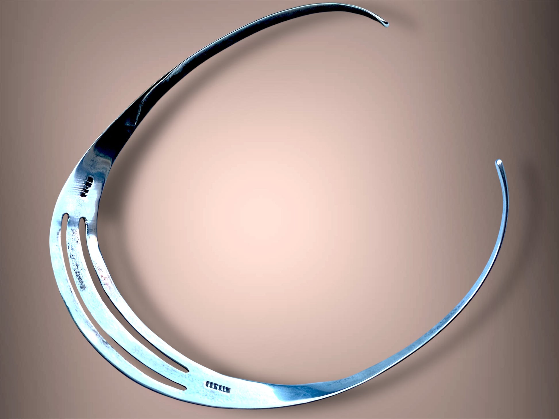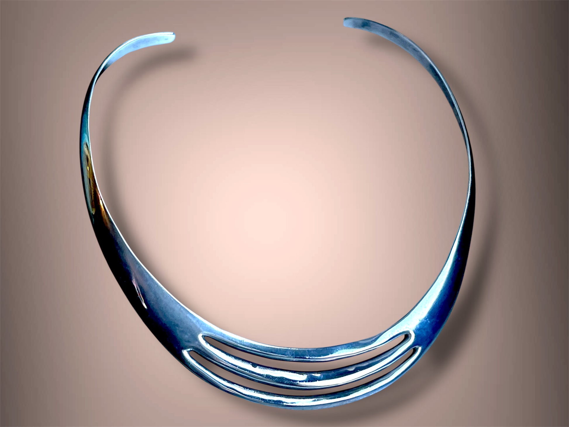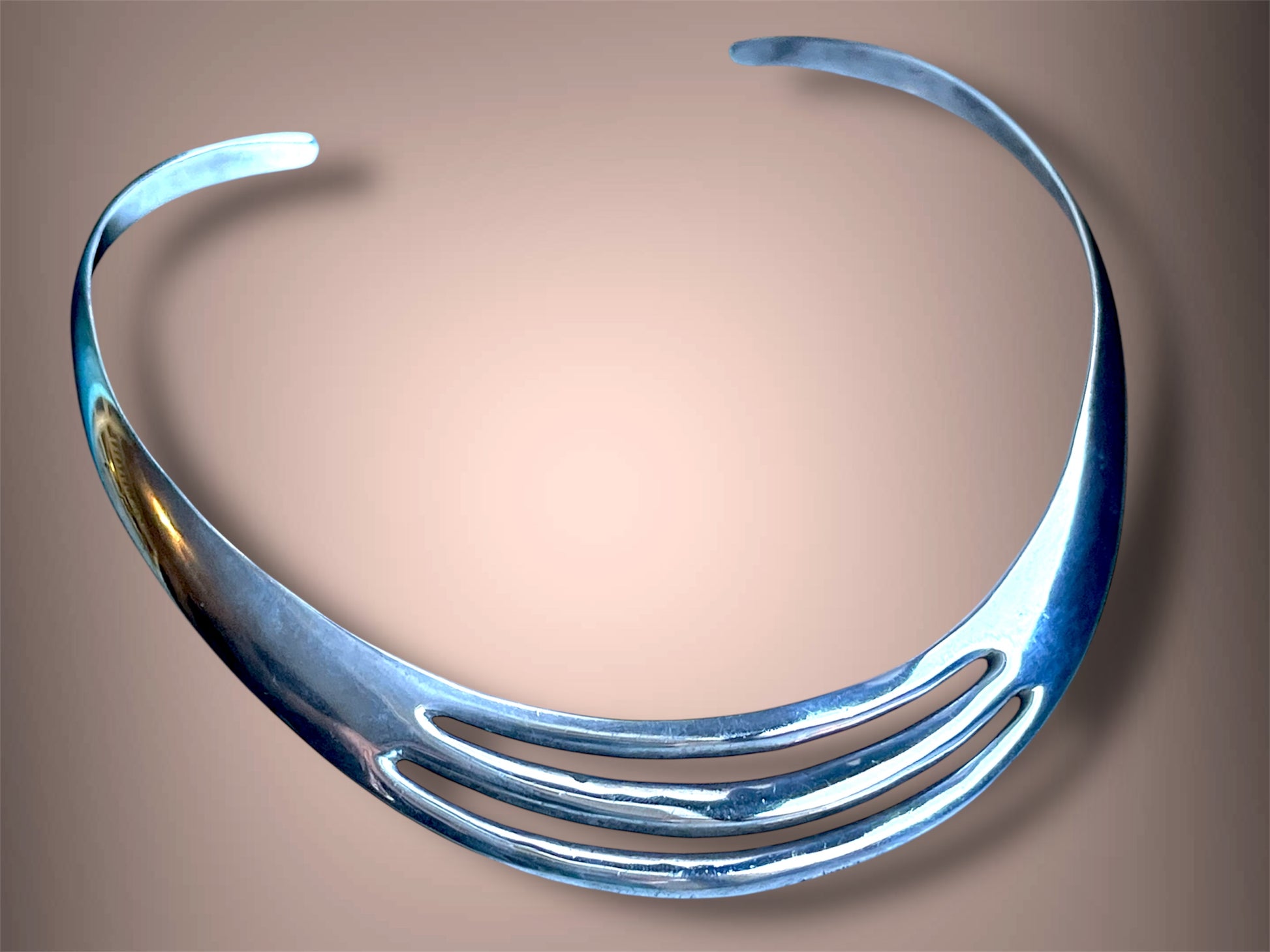 Vintage solid cast Taxco sterling silver chevron style choker cuff style necklace with two rounded openings at the center. Hallmarked “925MEX” on one side and “TV-13” on the other. Molded by hand around a chest form to sit perfectly on a woman’s décolletage. Weighs 35g. 13.5” end to end external measurement, with an additional adjustable gap that measures +\- 2”. Internal measurement is 12.25”. Width at the center is 18mm and tapers down to 5mm width at the ends.