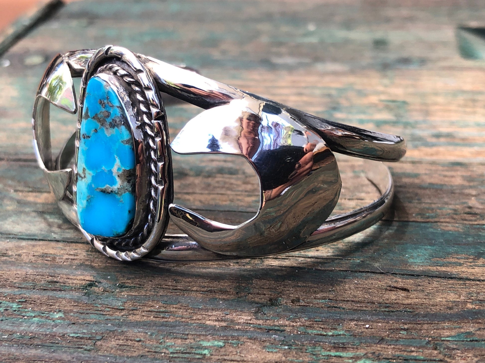 Vintage Turquoise Native American Sterling Silver Southwest Old Pawn Moon Cuff Bracelet
