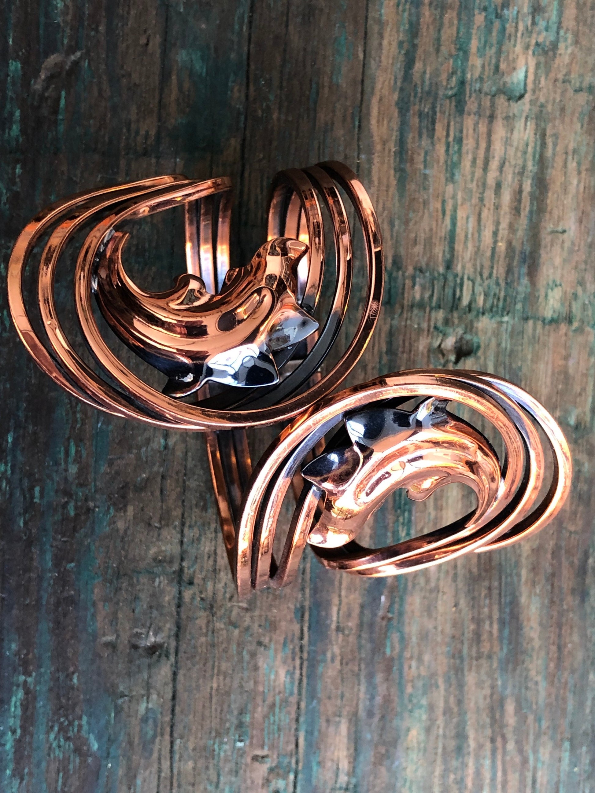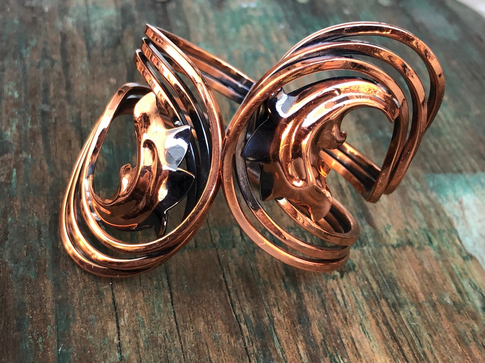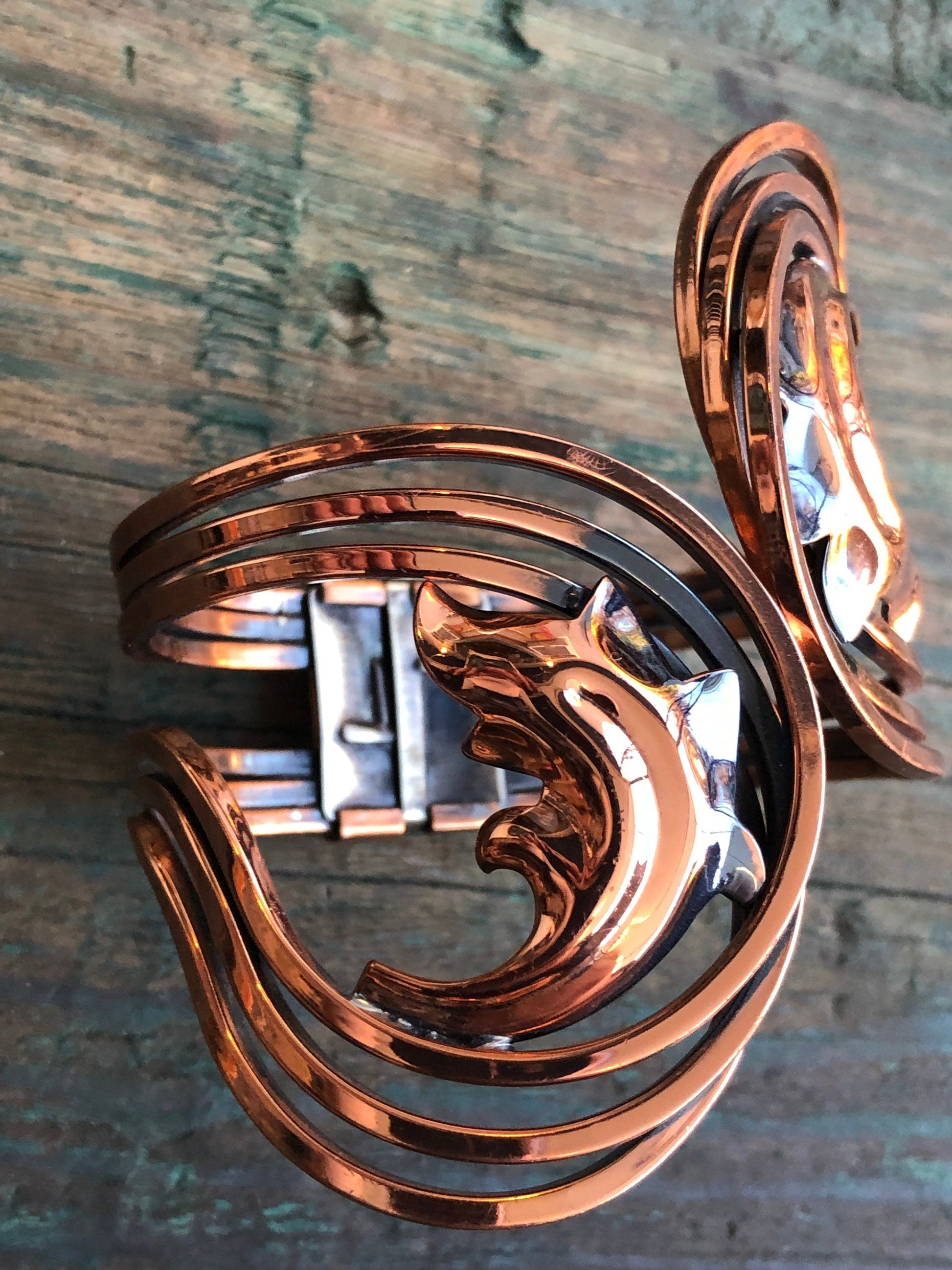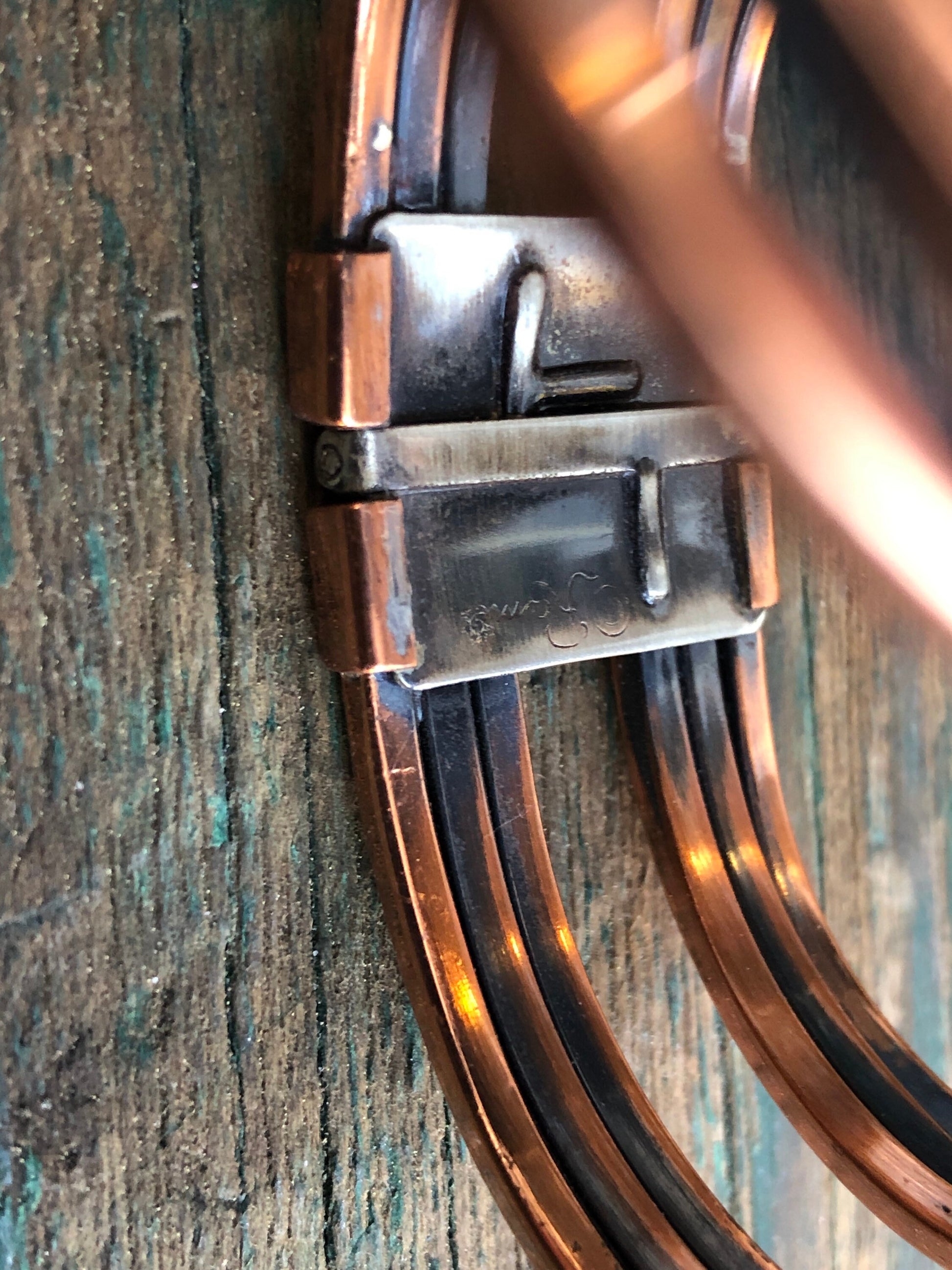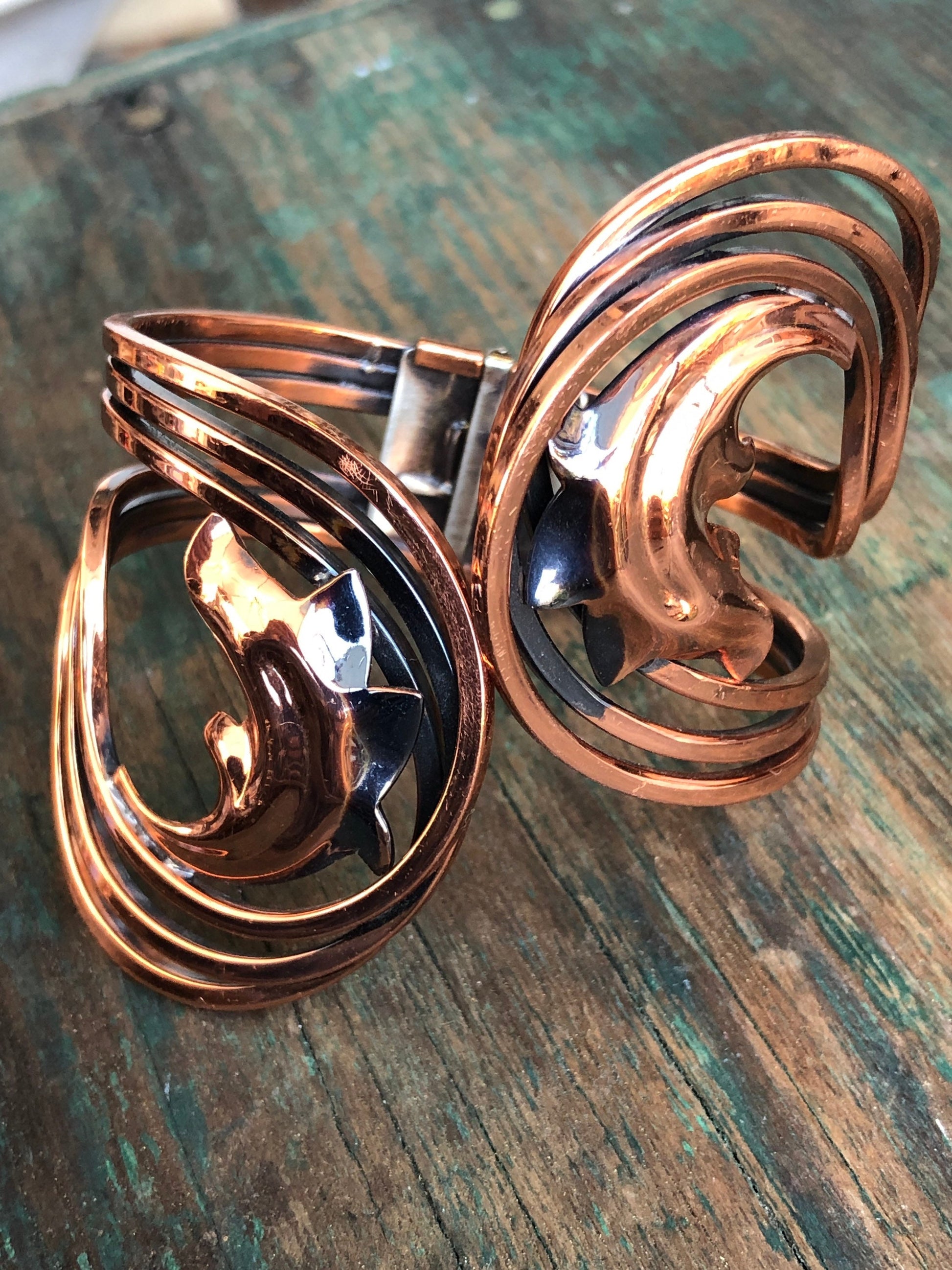 Beautiful vintage 1940’s copper hinged clamper bypass bangle bracelet. Signed Renoir on the underside of the hinge. Gorgeous handmade multi strand copper ellipse with a wave detail in the center. Perfect condition with no damage.