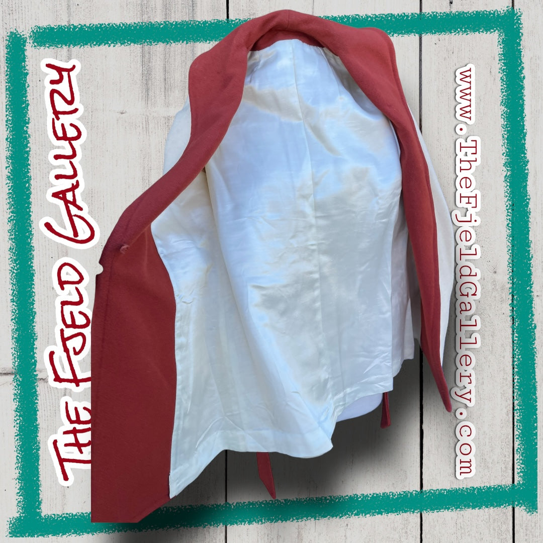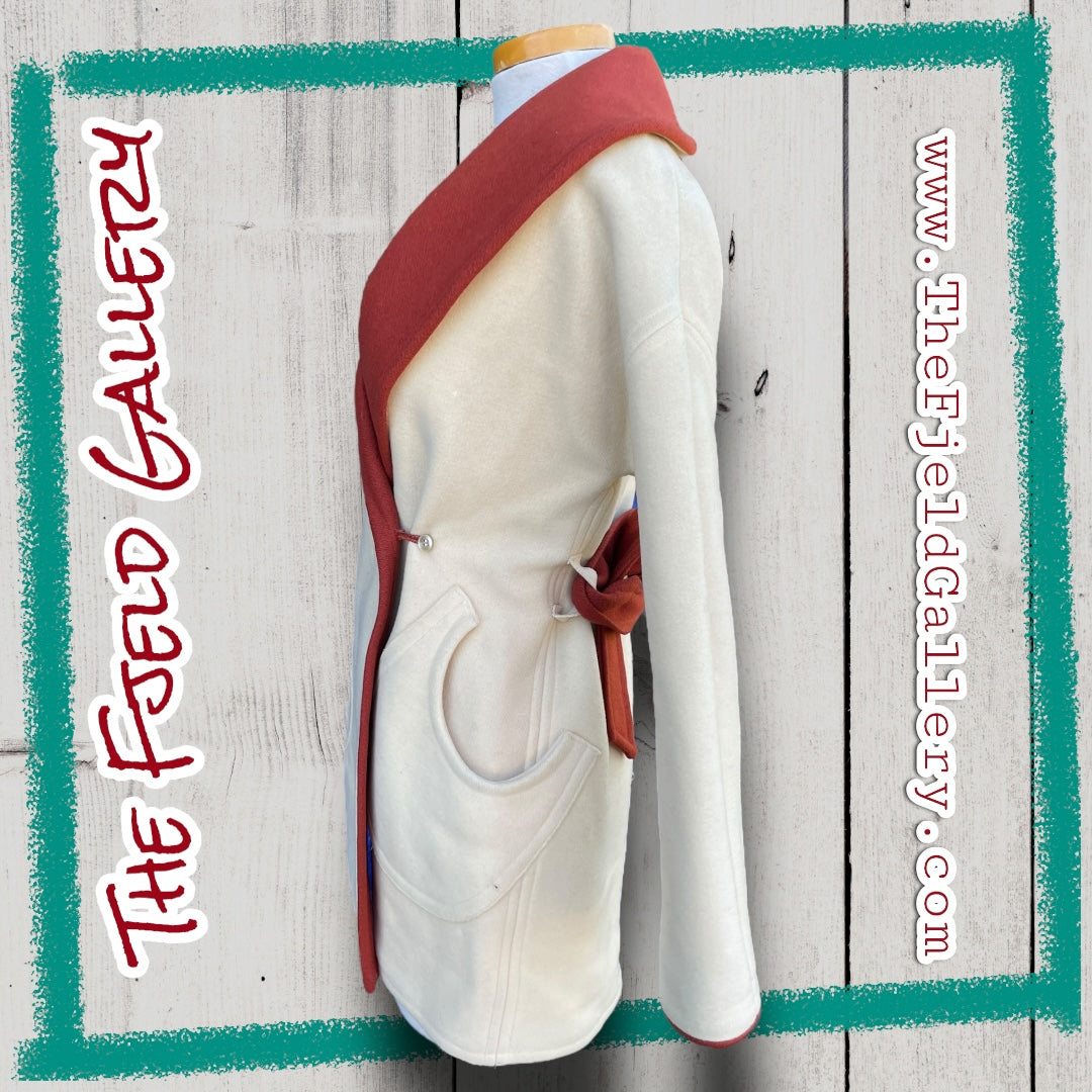 Beautiful and unique cream and rust orange wool robe style coat with waist tie and single button closure. Large collar in rust with a perfectly in tact lining. Size S/M