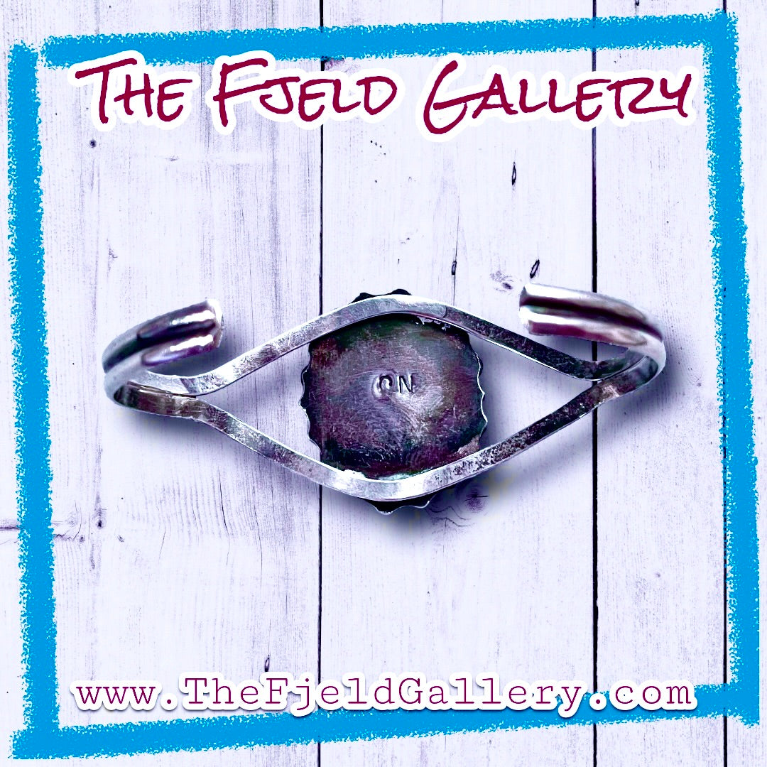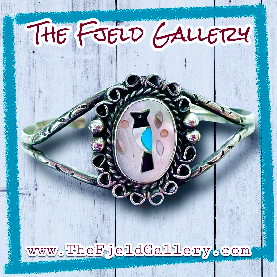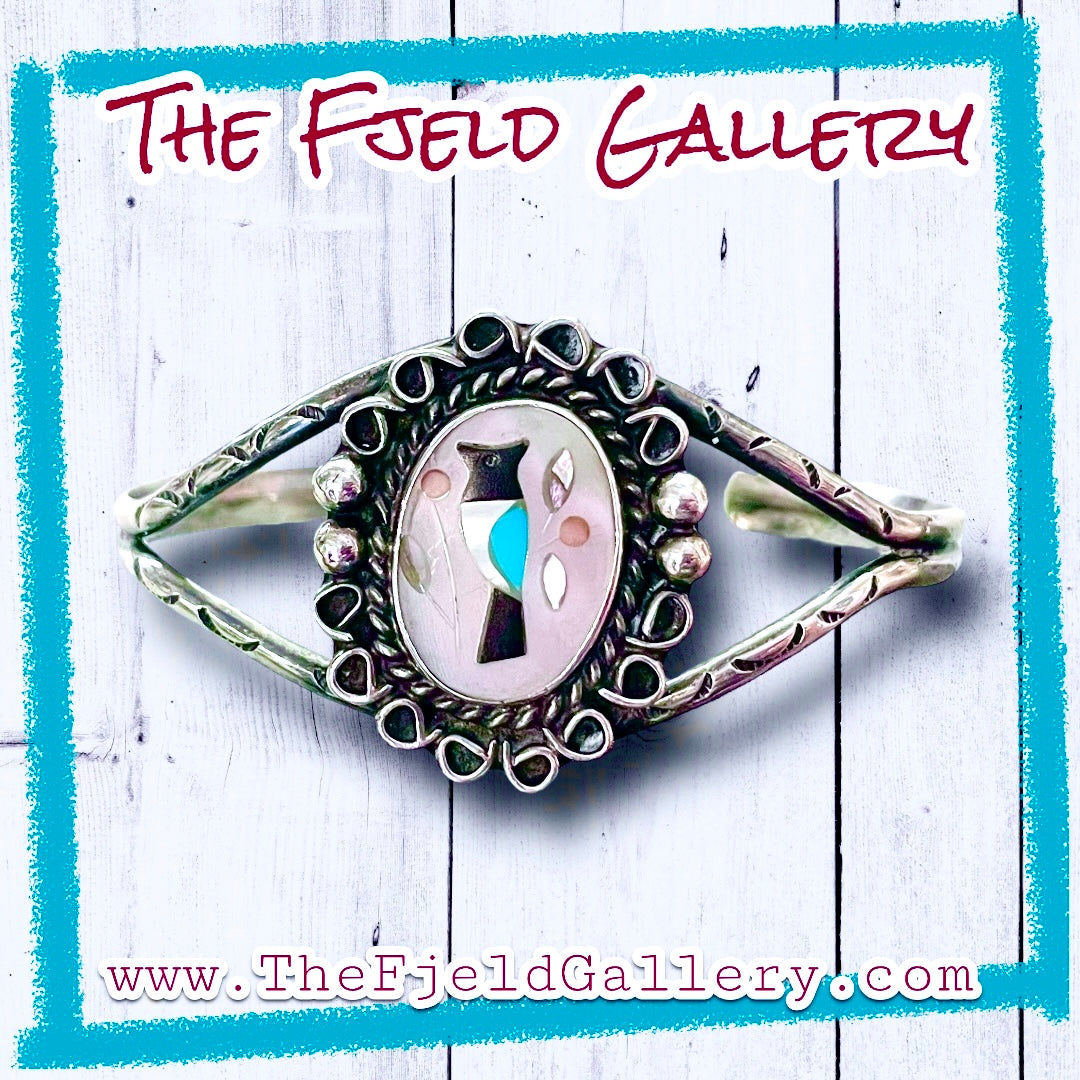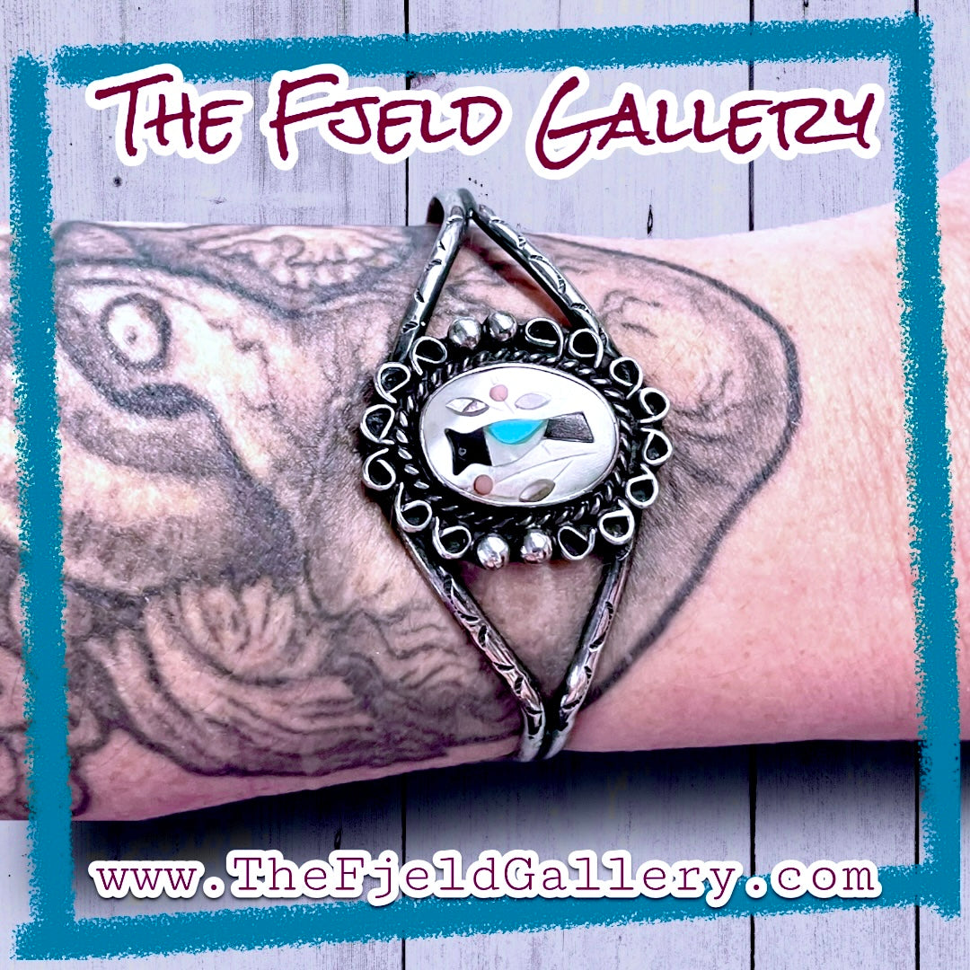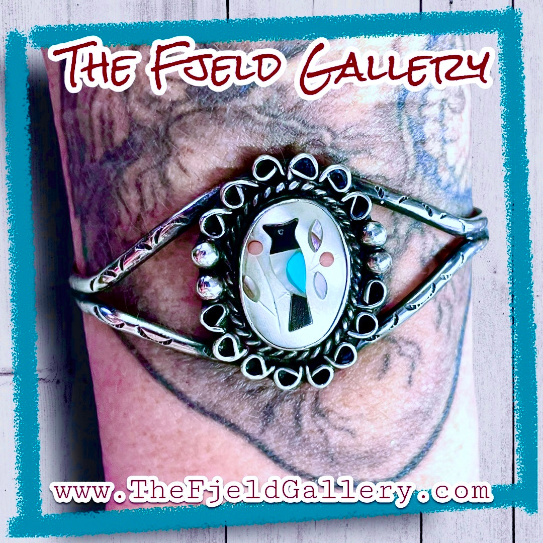 Vintage Zuni Native American Woodpecker Blue Bird Sterling Cuff Bracelet