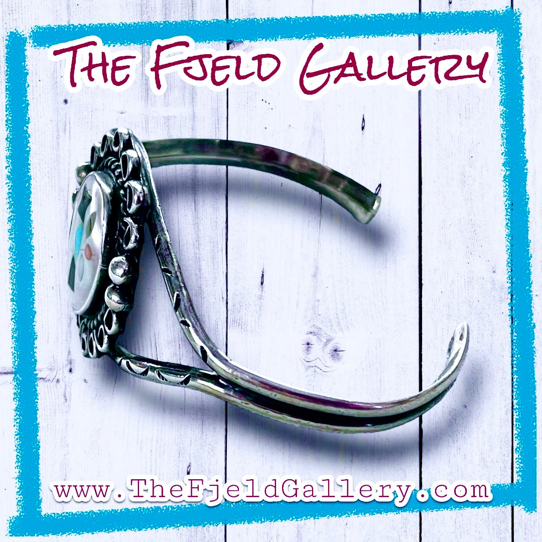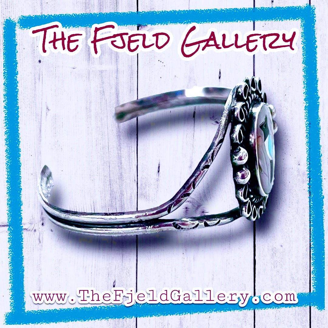 Sterling Silver Zuni Native American cuff Bracelet with an inlaid woodpecker bird in turquoise, onyx, mother of pearl and abalone. Adjustable cuff bracelet.