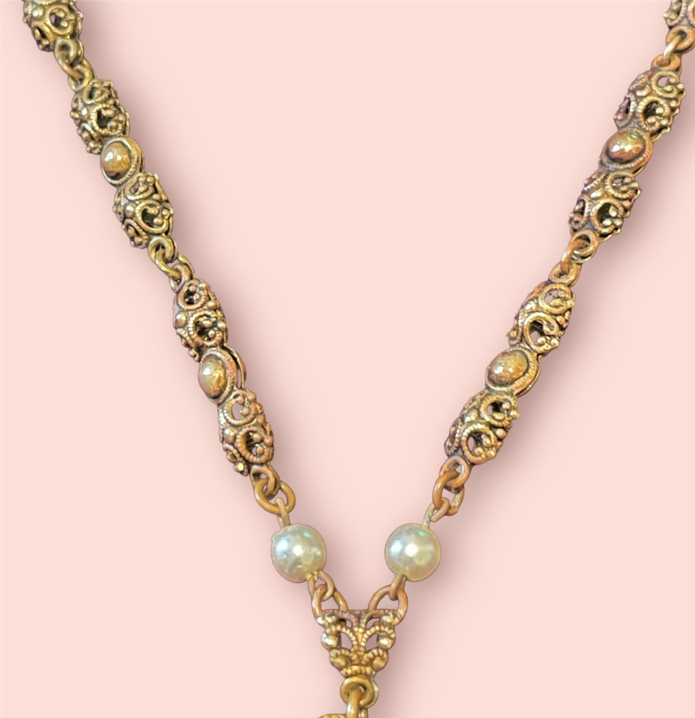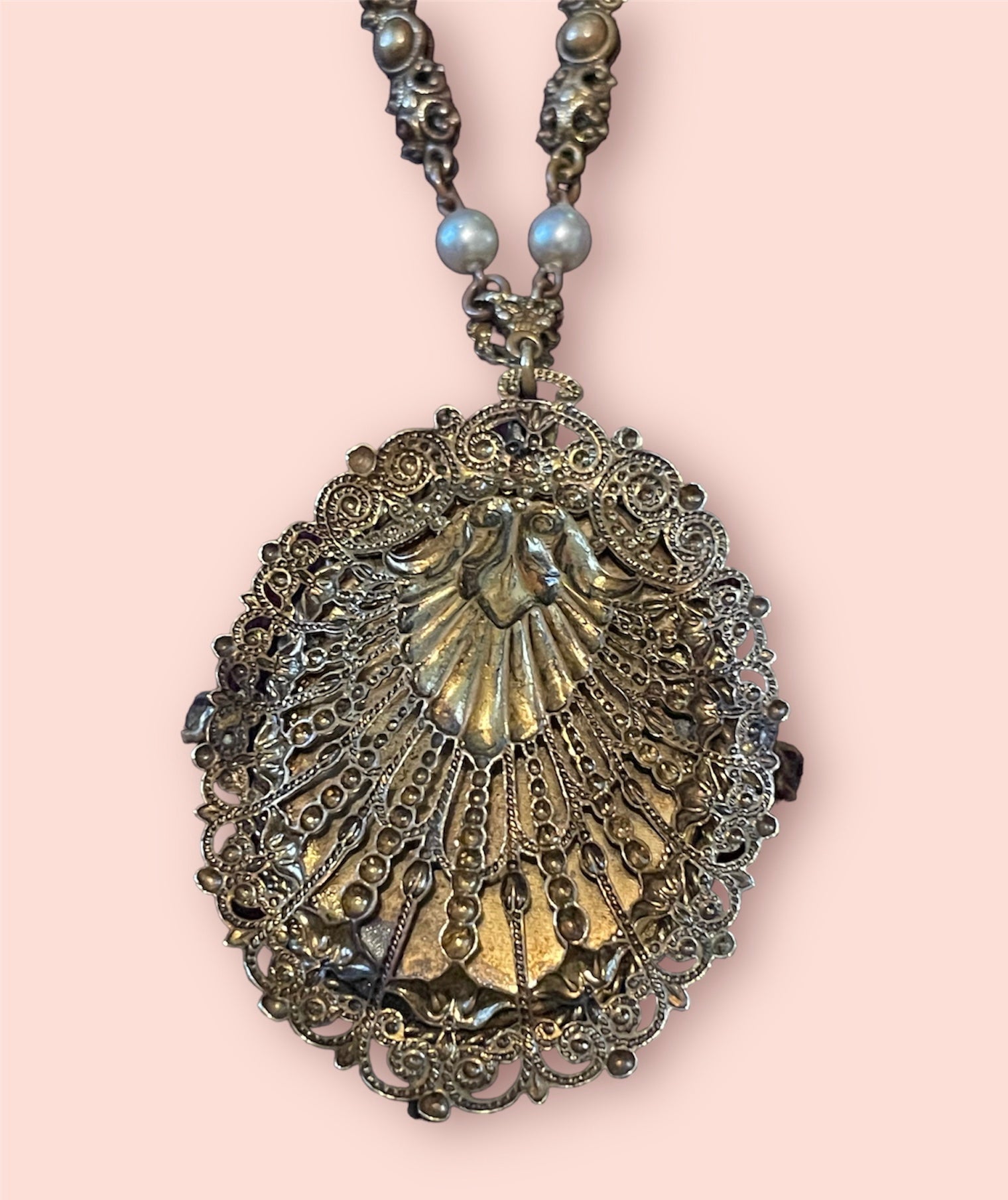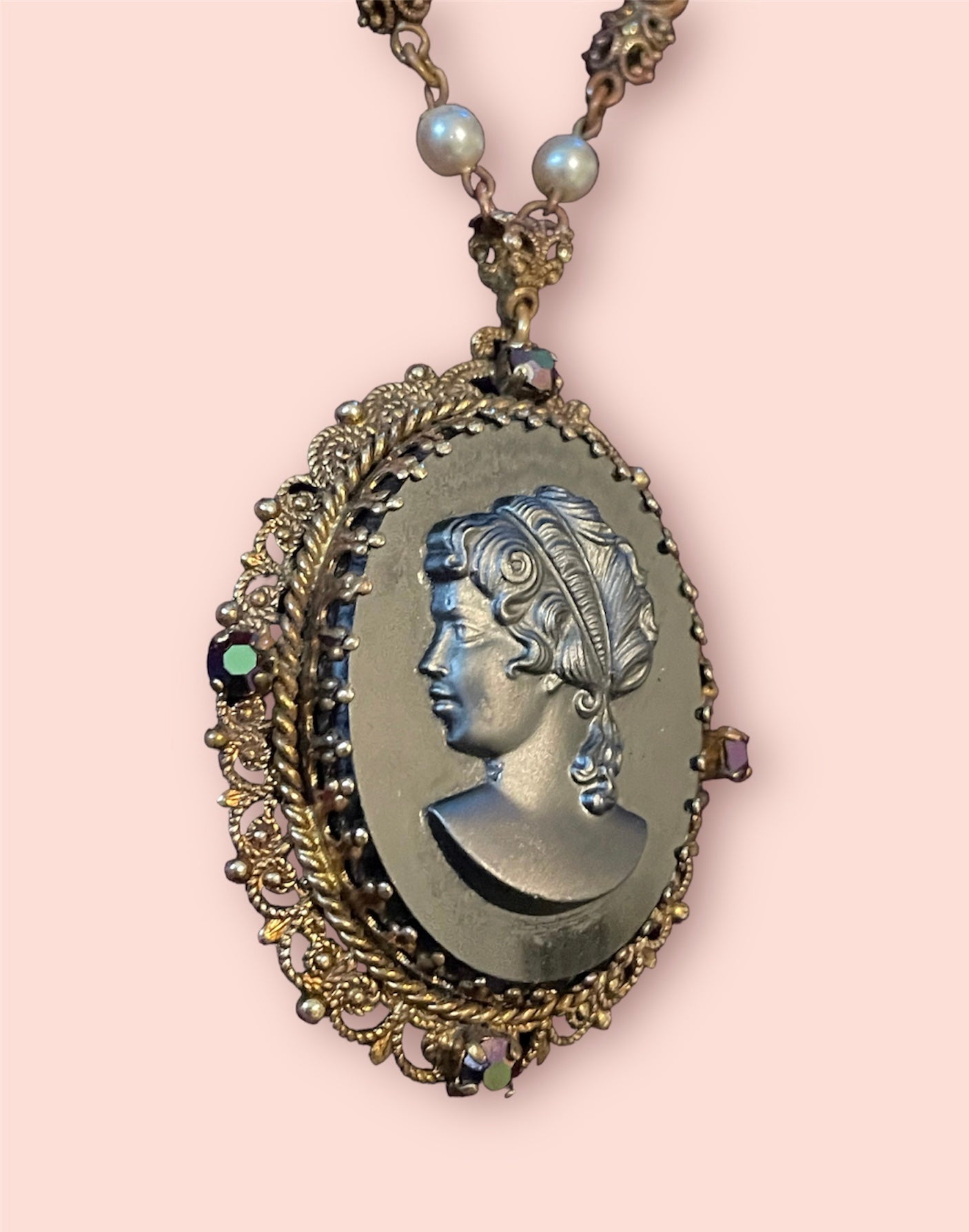 Beautiful vintage West German 1940 brass filigree black hematite glass mourning cameo necklace. Surrounded by Aurora Borealis crystal rhinestone detail and pearls on the original chain.