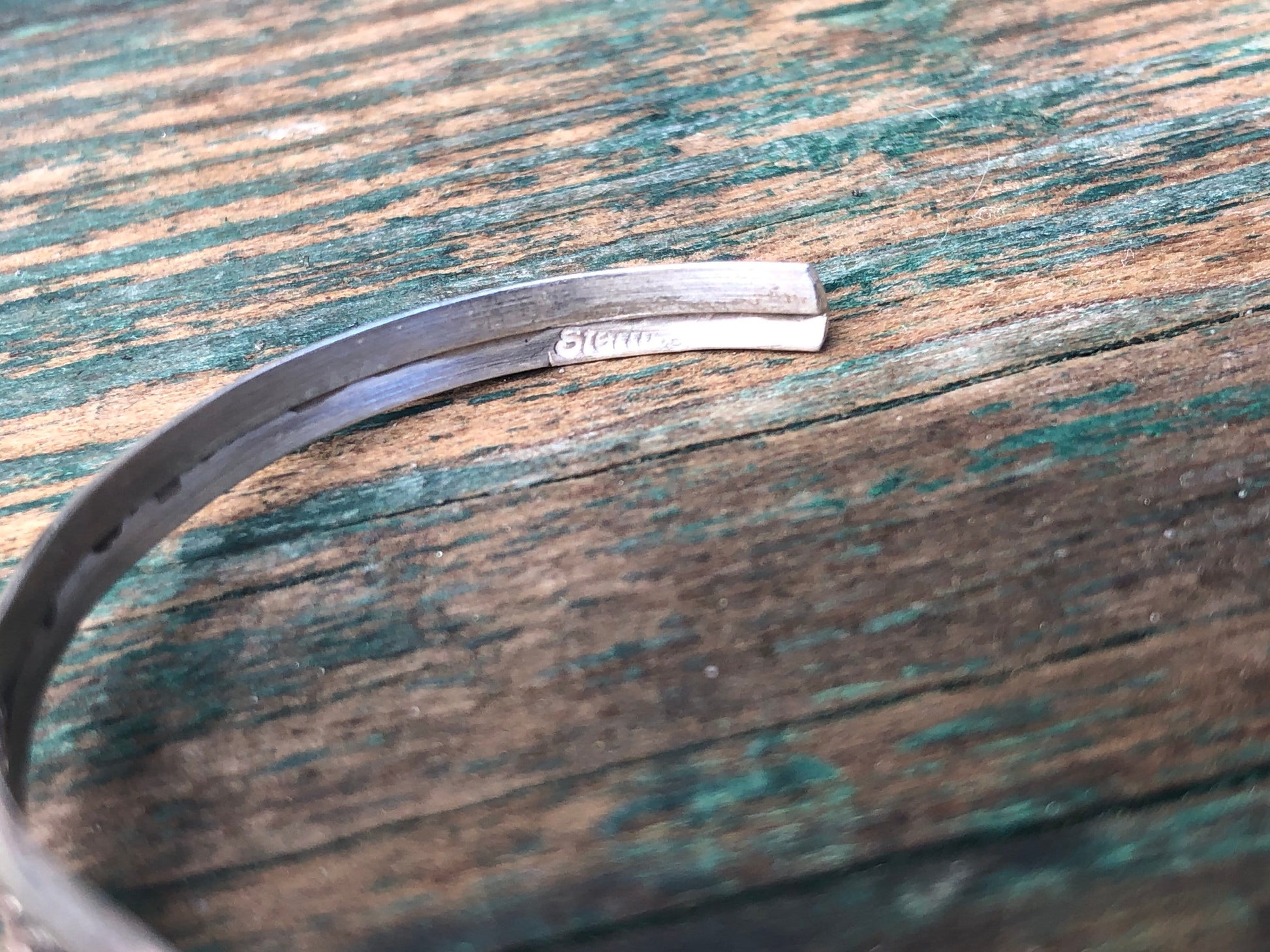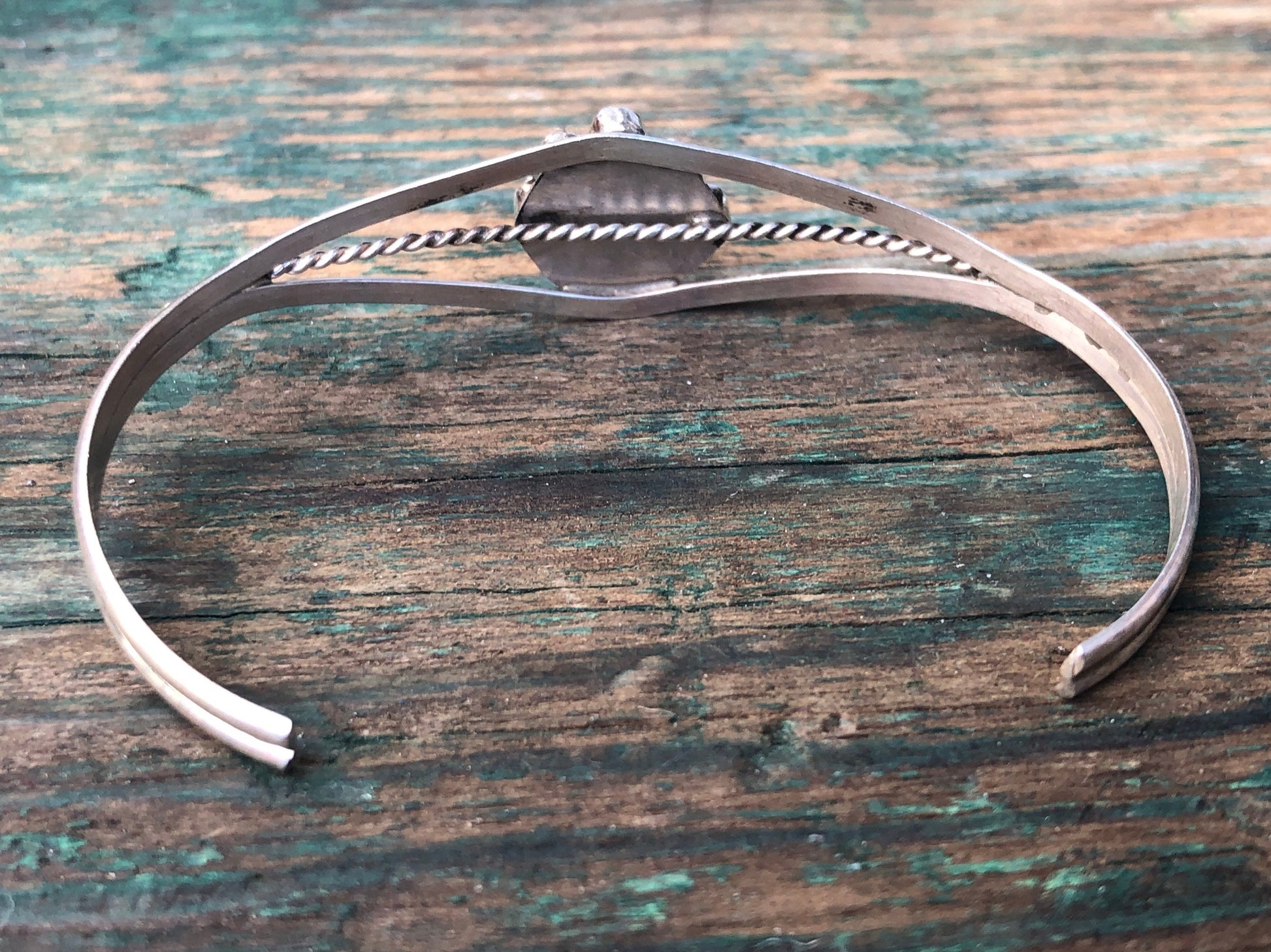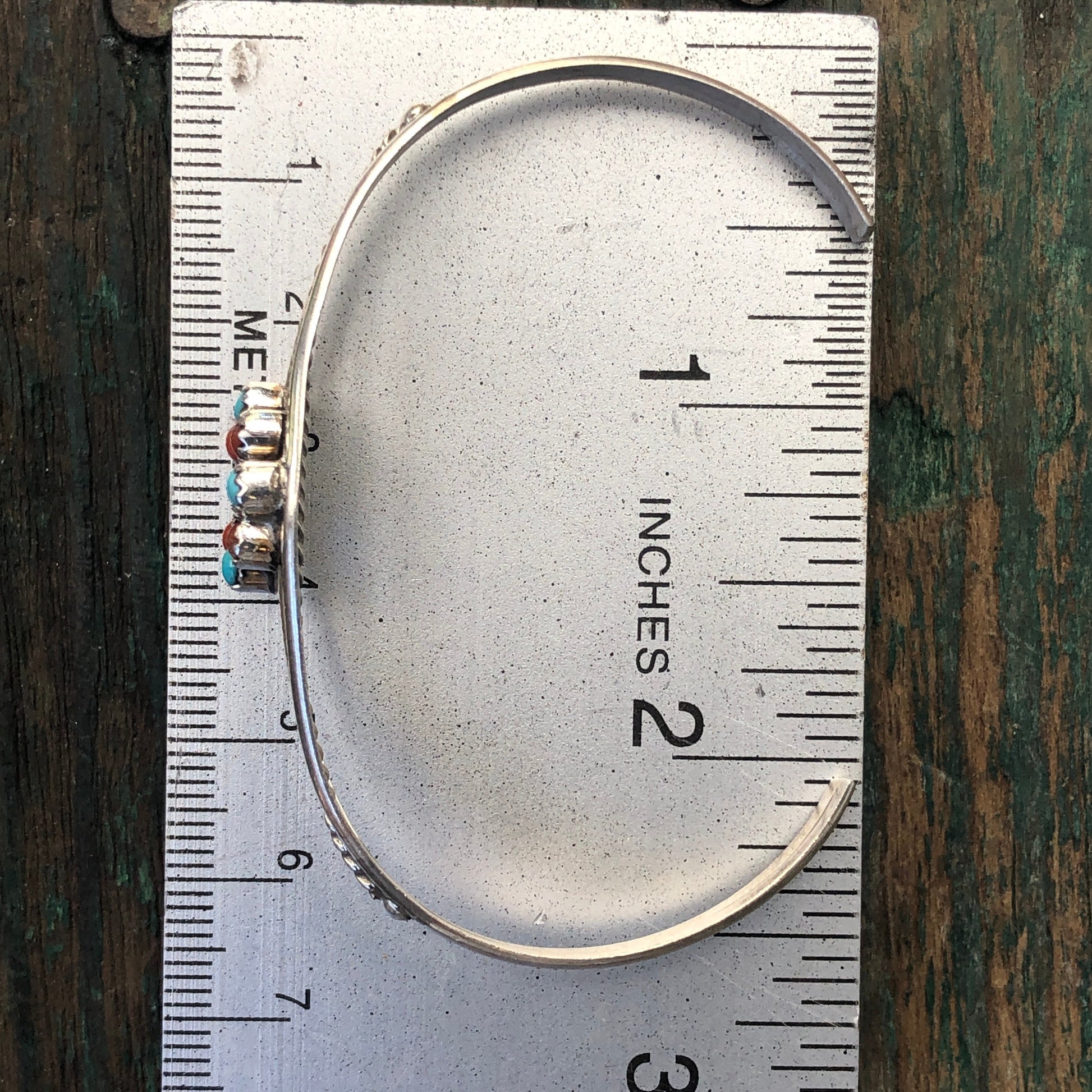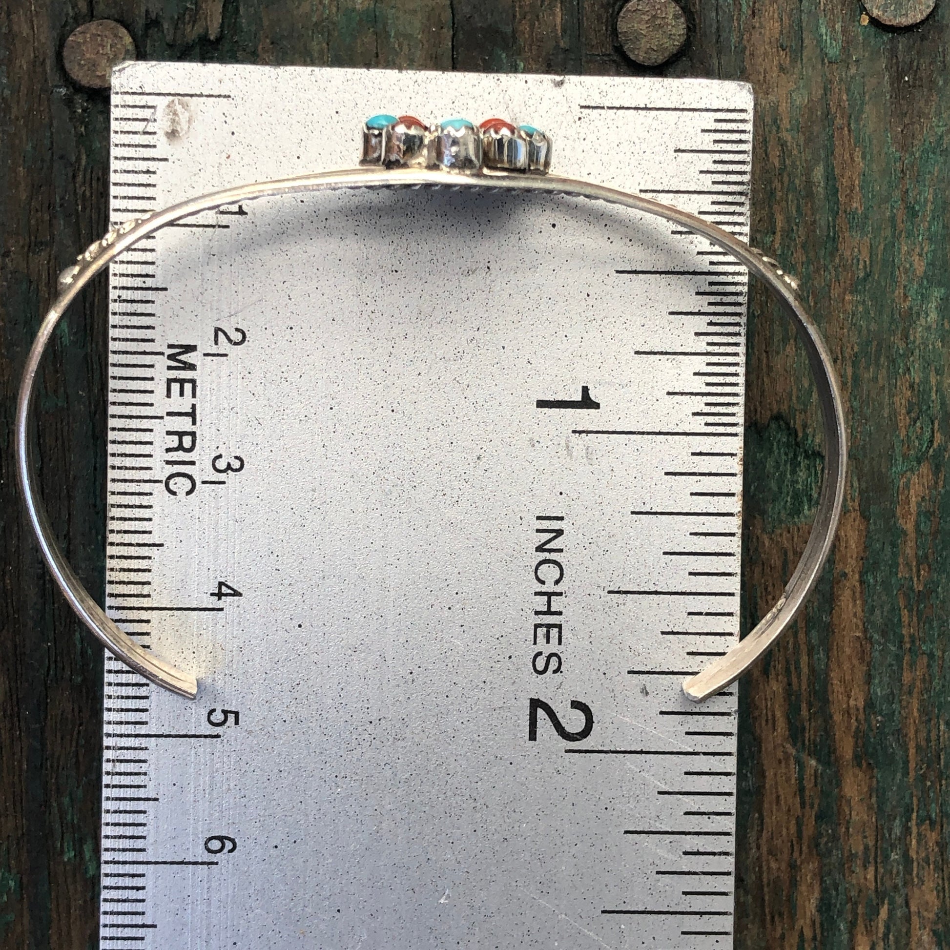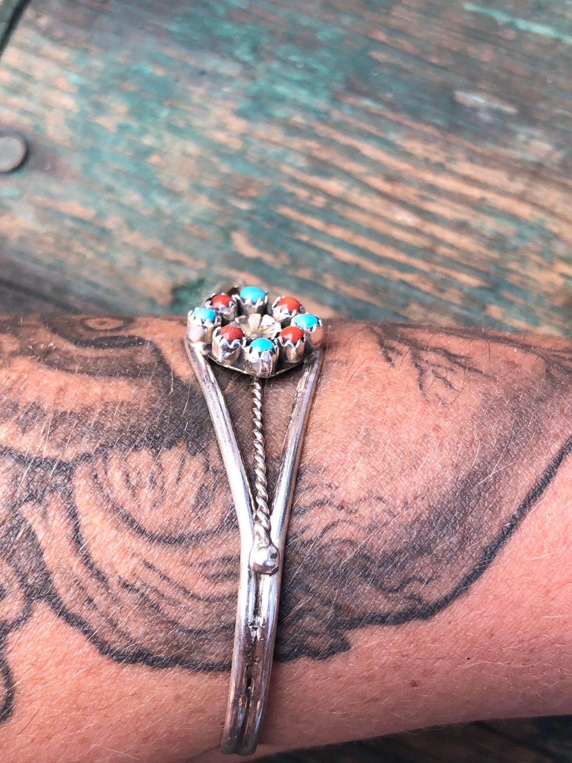 Beautiful vintage sterling silver Old Pawn Arts and Crafts style petit point Zuni Native American cuff bracelet. 4 round turquoise gemstones and 4 round red coral gemstones bezel set with serrated bezel wire in a circle around a sterling daisy flower. 2 half round sterling wires come together to make the cuff band with a twisted wire in between the two half round wires with raindrop detail on each end. Back of cuff wires are stamped “Sterling” hallmark.